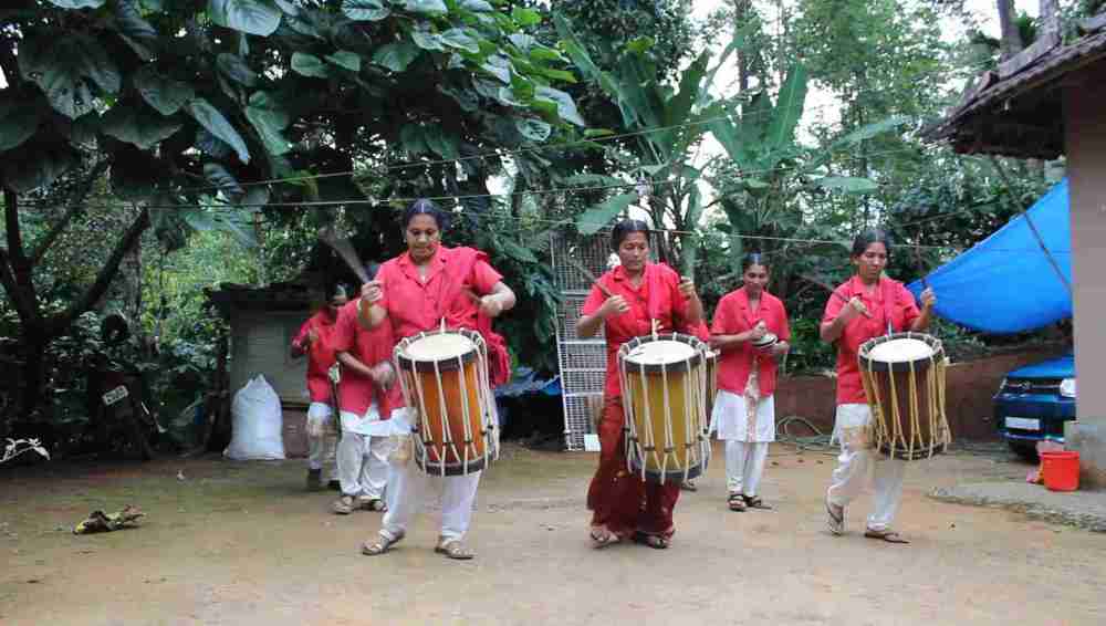 Puis cinq photos de Mothakhara : un groupe, une route, une représentation : les femmes tambours…