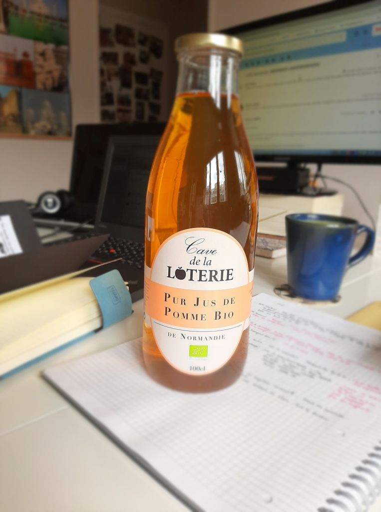 And here, too, we are beginning to see the signs of a humanity that cares for others whenever necessary. And here too, I am all moved, all turned around and have tears in my eyes. No, not tears of rage or distress as these last few days when I hear our rulers, but tears of joy, of humanity. The bottle of organic apple juice sits enthroned in the middle of my teleworking tools. It is there proudly, as a victory of humanity over the soulless world that our rulers want us to accept.