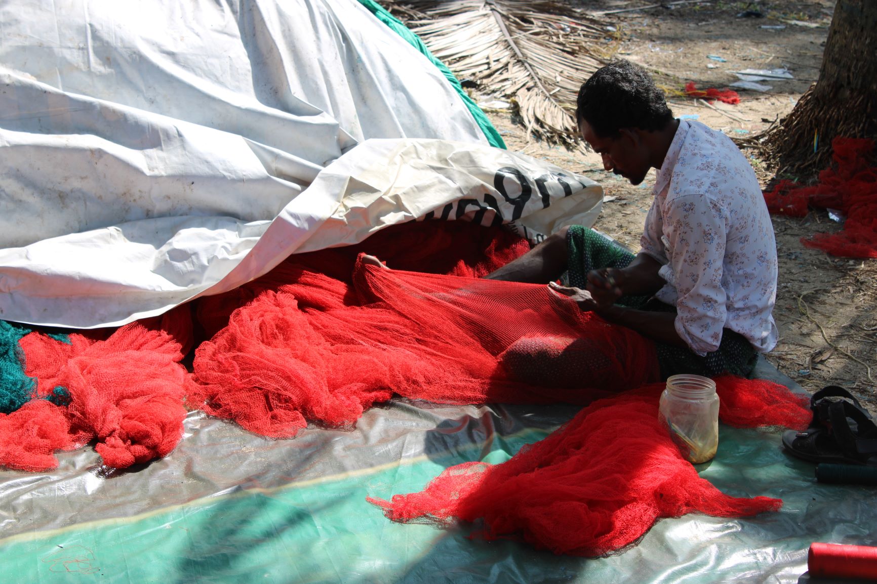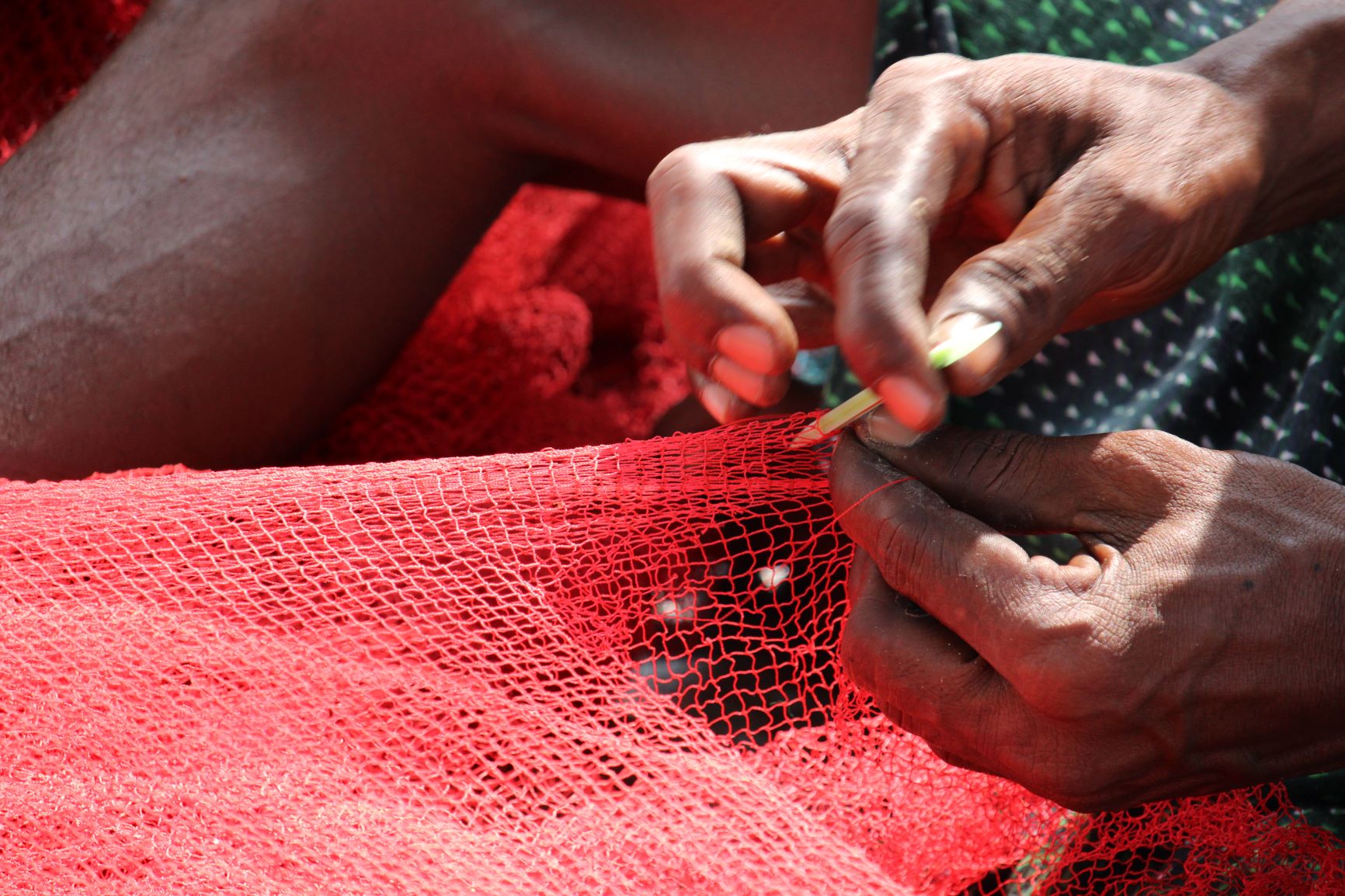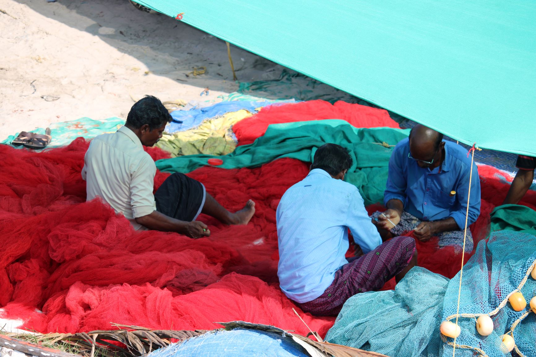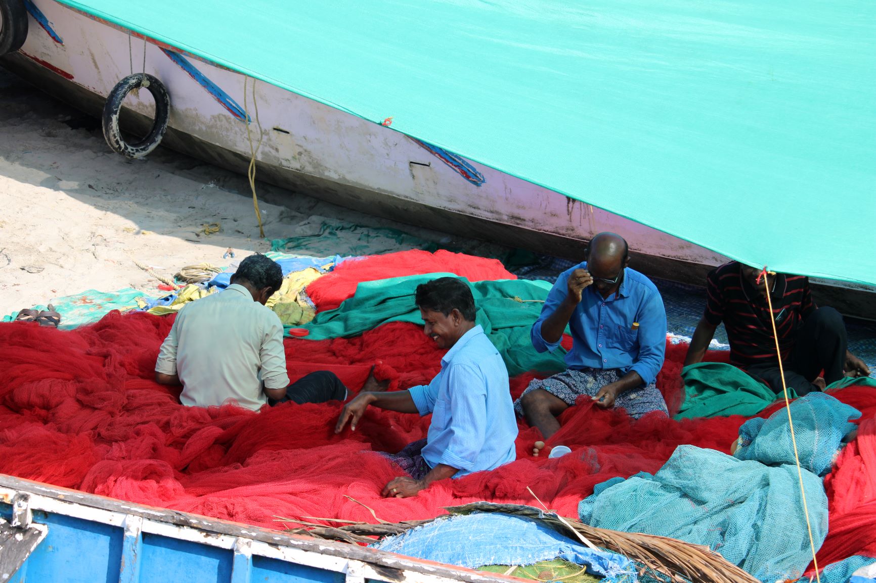 The fishermen of this small bay near Cochin, Kerala, also belong to me. The men take advantage of this work to make it a real moment of exchange. Beyond the threads that are woven, it is humanity that weaves its great web. Some are sheltered by a huge tarpaulin to protect themselves from the bite of the sun. They are seated, sunk in the softness of the nets, which are much brighter red than those of Essaouira. Expert hands know exactly where to start. Here too one takes the time to admire the work well done. There is also the man who isolates himself to take advantage of the shade of a large palm tree. In his hand, the shuttle comes and goes in a perfectly controlled gesture.