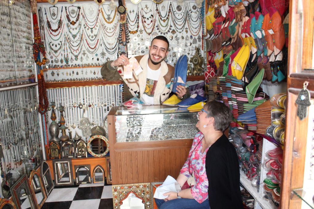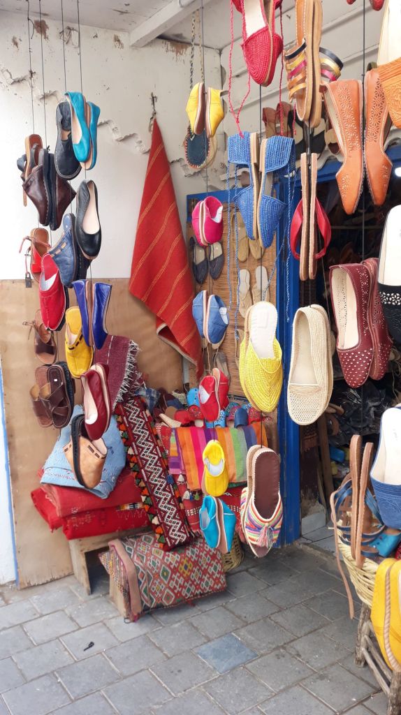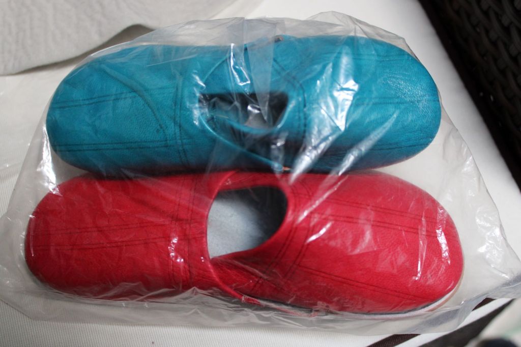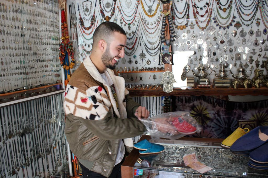 In a matter of seconds, the link is established. The shopkeeper struggles to find the sizes of slippers that match the desired colors. A pair of 16 blue and a pair of 18 red for one of their grandsons, a pair of 38 turquoise blue and two more pairs for the family in Switzerland. As a good merchant, he takes the opportunity to present a pair of worked slippers with a small heel. They are irresistible and very comfortable, of course… The young shopkeeper’s name is Amine and he is very friendly. He carefully wraps all the slippers, then presents with delicacy the earrings. He also gives some good advice.