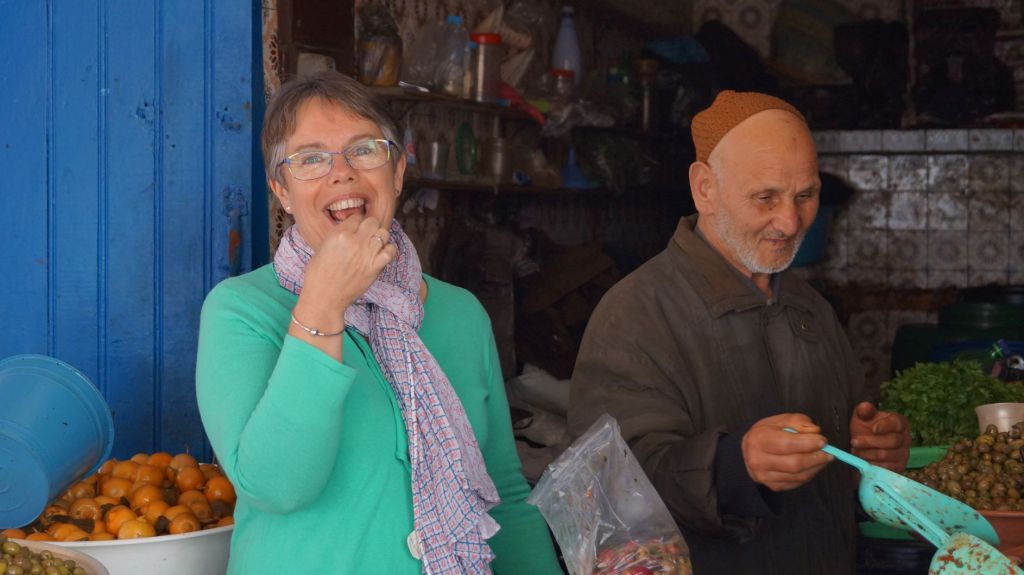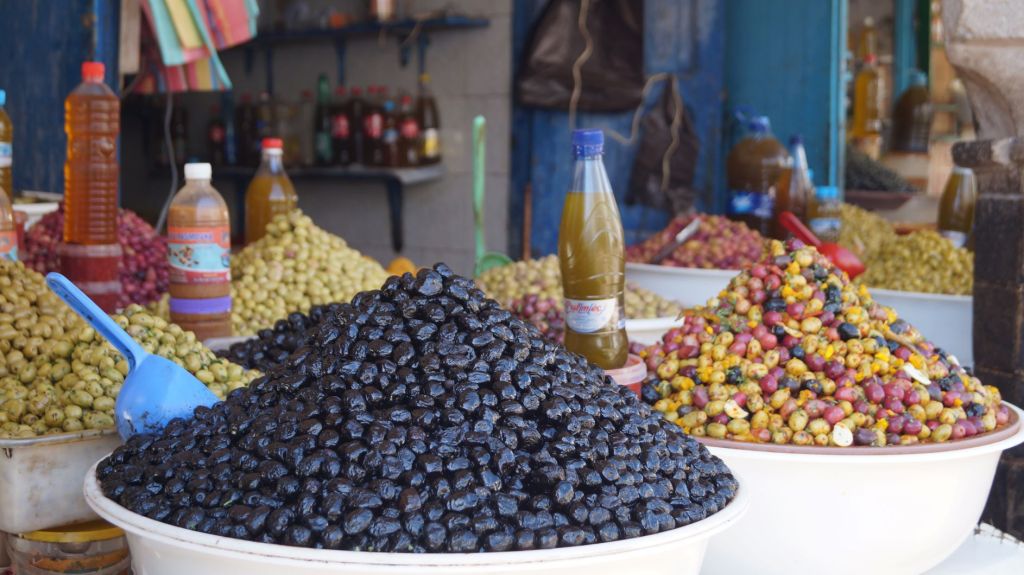 Like every morning, she goes shopping, with her friend Souirie, in the souk located in the heart of the Medina of Essaouira. First, they plan to go to the olive merchant. The one who runs the small shop, at the very beginning of the Mohamed Zerktouni Avenue and who always wears her most beautiful smile. A small, well-cut goatee, a mole under his left eye, his hands are always shiny from dipping them in olive oil. He serves his customers with love and revels as soon as he sees them tasting his olives. He is so generous that he adds at least twice as many olives, once they are weighed, to make you a little gift. His olives are presented in the form of well aligned cones. It is a delight for our eyes as Europeans in search of beauty.