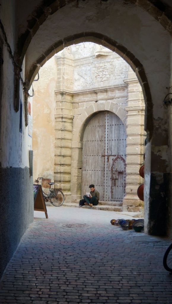 The sun is shining brightly and it is time to go to the more shady streets of the Medina. On the steps of a centuries-old doorway, a young man is immersed in a novel. He is so absorbed by his reading that the passers-by, who keep coming and going in front of him, do not even disturb him.