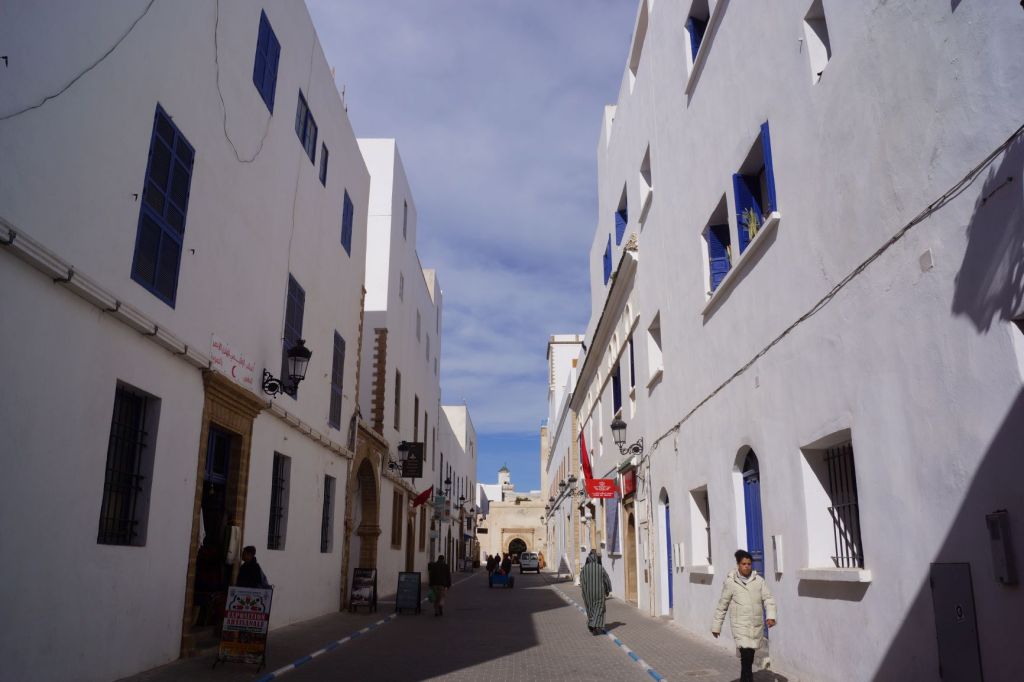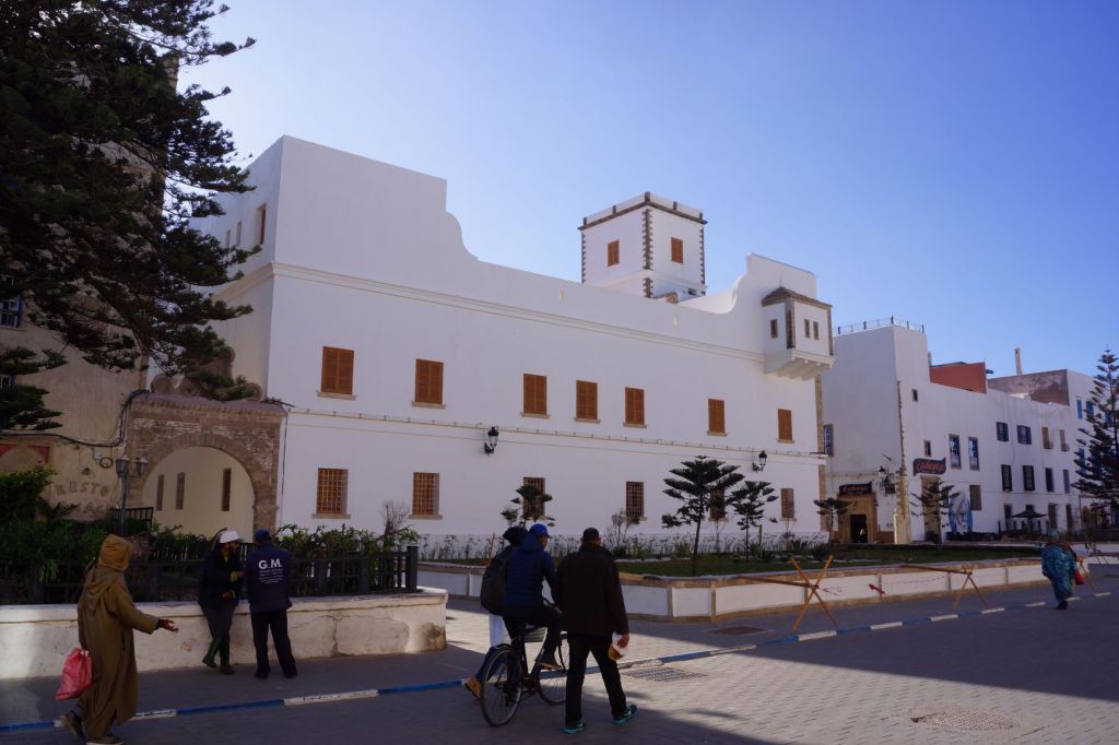 Our travellers then make a quick passage through Cairo Avenue to admire the restoration work carried out on the buildings at the corner of the street. A few meters away, in front of one of the tastefully restored doors, a little cat is squeezing into the only corner still in the sun. In this area the shade has regained some ground. The Medina gives us an eternal fight between the shadow and the sun. Each corner invites us to guess which of one or the other will have taken over. In front of the tourist office, a man with a black and grey striped burnous has pulled up his pointed hood to protect himself from the coolness in the shade of the high walls. Meanwhile, a porter delivers the precious argan oil to the women’s cooperative that is installed in the middle of the street.