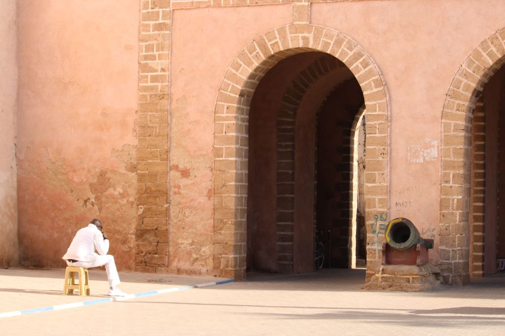 After some hesitation, our friends prefer to go to the three gates, in Oqb Ibn Najraa Avenue, which is still sunny. An African man, dressed all in white, is meditating. He is sitting on a small yellowed plastic bench, facing the cannon sealed in front of one of the doors. What is he thinking about right now? His clothes are dazzling in the reflections of the sun and contrast with the shadow that can be seen under the double doors.