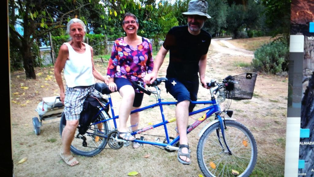 Amici italiani, vi immagino voi, madre e figlia, che vi guardate l’un l’altra, che riposate all’ombra del pergolato, in cima al giardino, vicino alla nuova cucina di Umberto. Avete raccolto tutti i pomodori biologici e maturi dalla vostra azienda agricola biologica. Da dove vi trovate, la vista sulla laguna di Marta è infinita e si sente Umberto impegnato in cucina per deliziare gli ospiti che avranno la possibilità di degustare al tavolo della Cucina di Merlino, i suoi meravigliosi primi piatti di pasta con fiori di finocchi appena colti. Entrambi vi divertite a sfogliare gli articoli in cui riconoscete questi due francesi, che una bella mattina sono apparsi sul loro tandem in mezzo al vostro giardino.