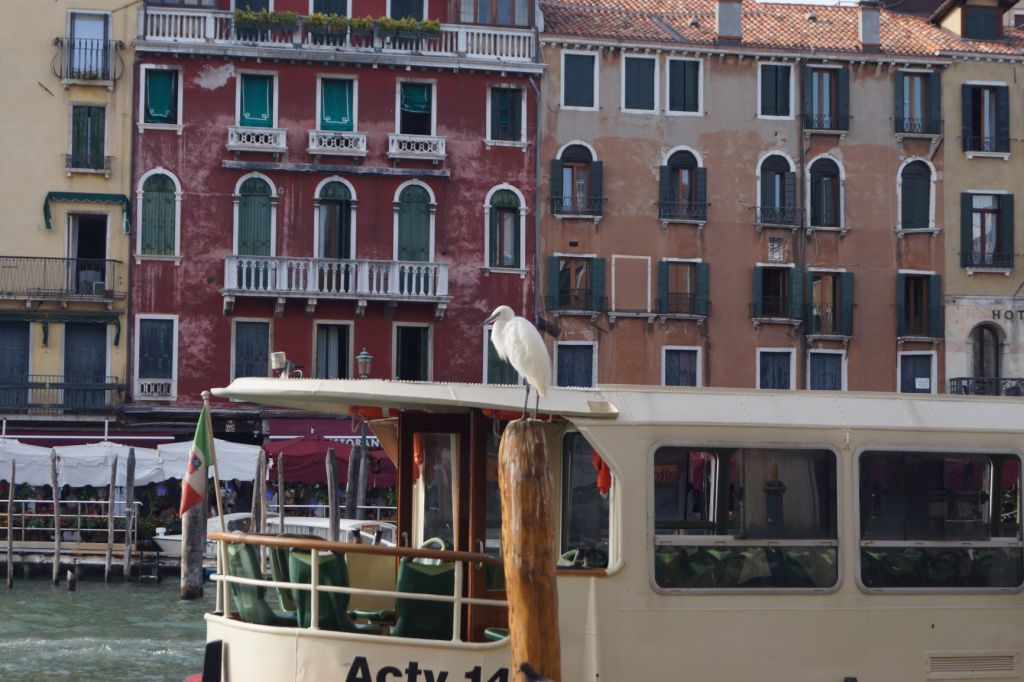 Arriving at stop 14, land and wait in the company of a stowaway who is also watching from the top of his stake for the arrival of the vaporetto.