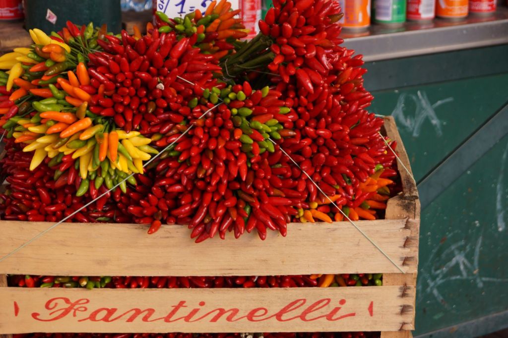 Landing at Fantinelli’s and remaining dumbfounded for a while, in front of hundreds of bunches of peppers from the brightest yellow to scarlet red, passing through burgundy red and grenadine red. An explosion for the eyes promises an explosion to come in the mouth.