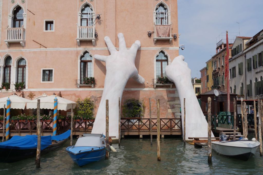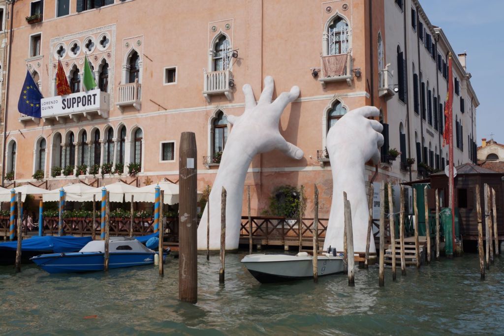 Fall under the spell of Lorenzo Quinn’s work: two monumental hands emerging from the waters and enclosing the Hotel Ca’Sagredo.