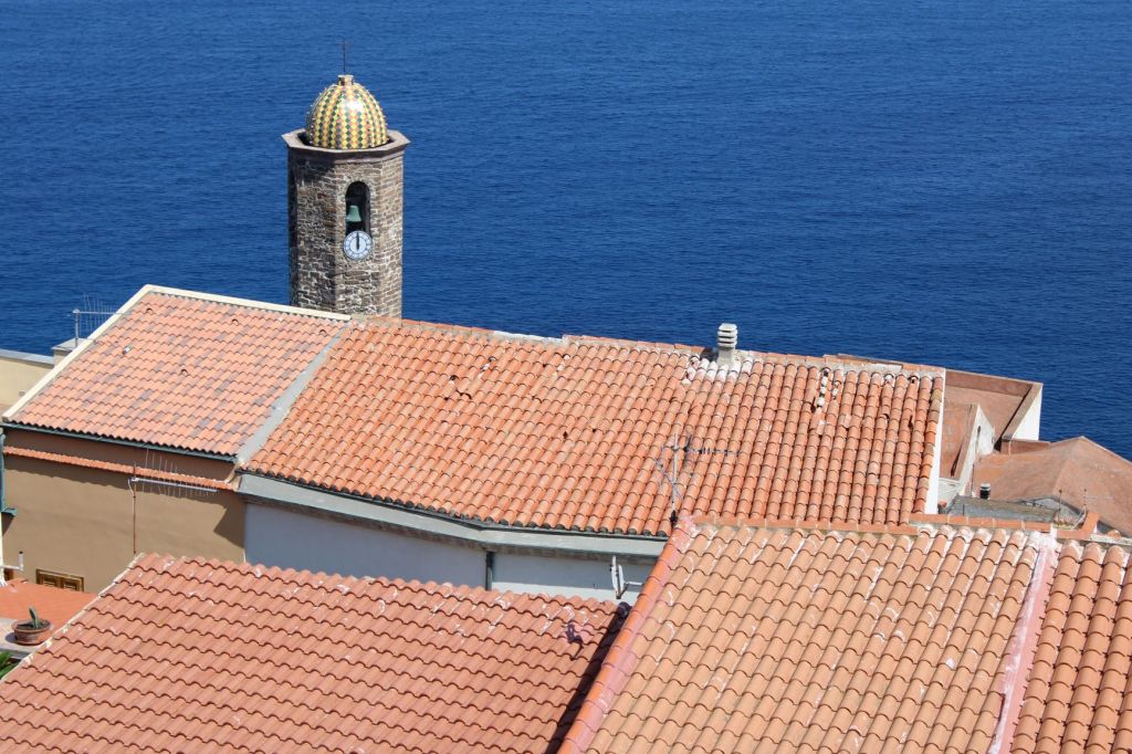 Être saisi par la beauté de ce clocher, recouvert de tuiles majoliques colorées, émergeant des toits de tuiles traditionnelles . Il est midi au clocher qui se profile comme un phare sur le bleu marine à perte de vue.