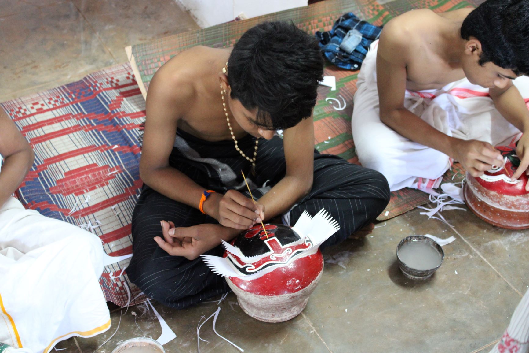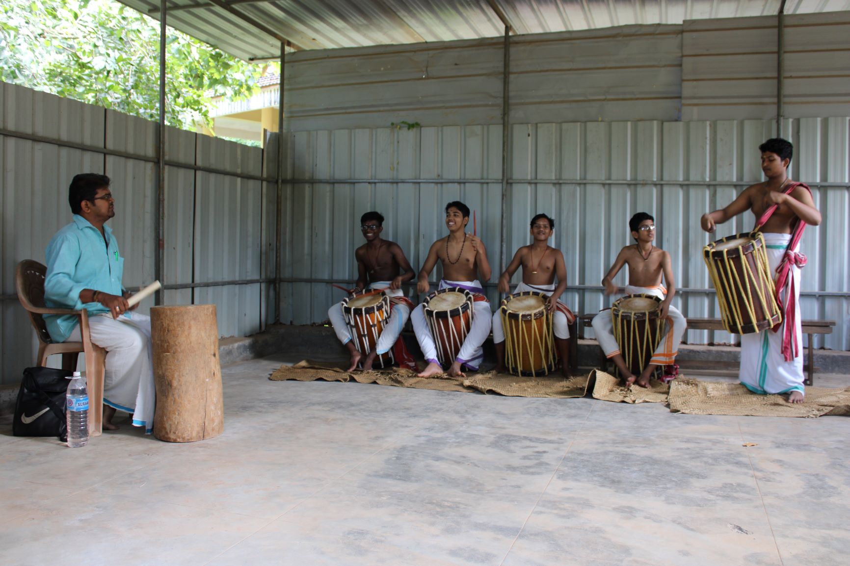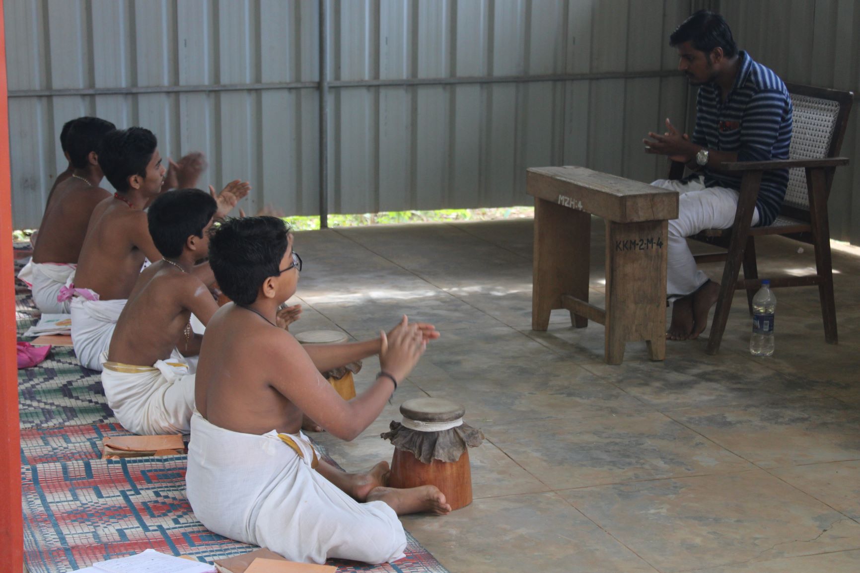 Forget everything while remaining astonished in front of the class of hyper attentive young boys from the Mizhâvu class; a terracotta instrument that was originally used to collect water and which is mainly used by the Nambiar community.