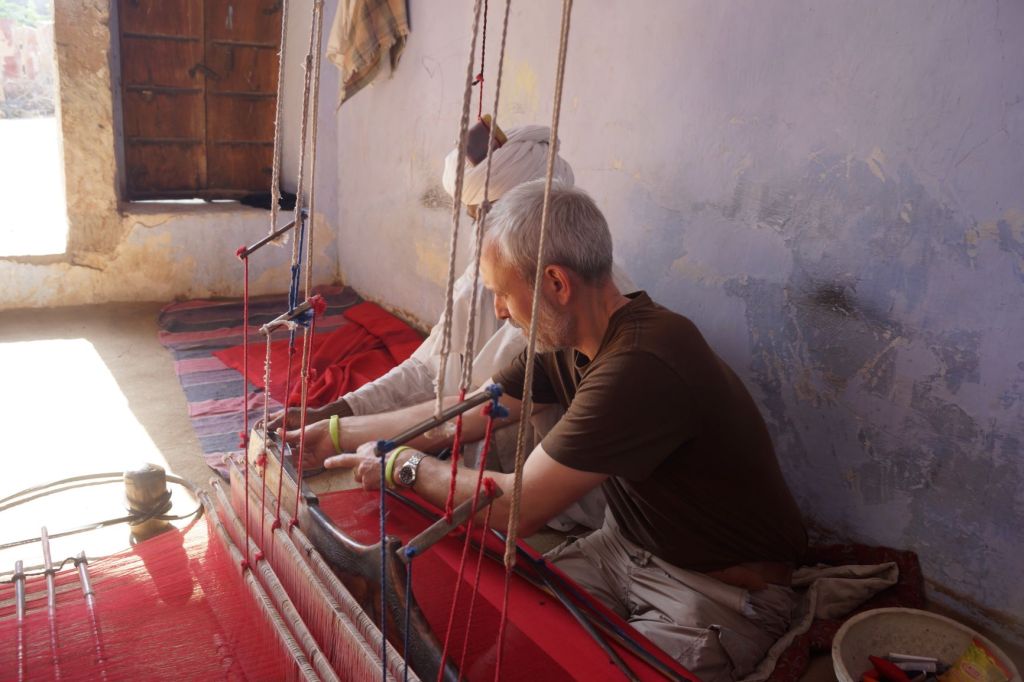 S’enthousiasmer devant les motifs qui apparaissent et se dessinent lentement, au fur et à mesure des passages de la navette entre les fils de trame. Contempler la naissance du tissu sur le métier ancestral.