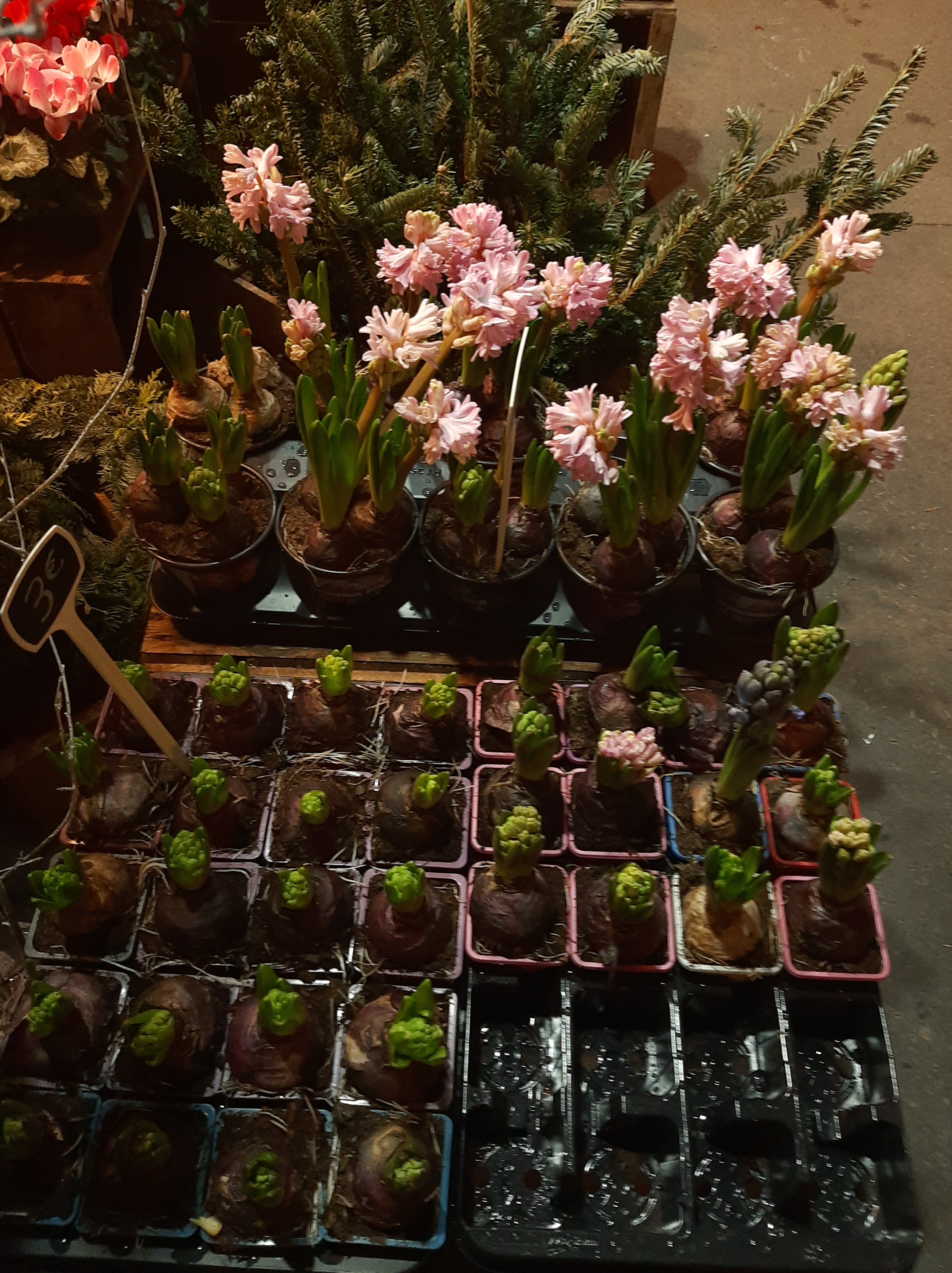 Before going out, just after exchanging a few very nice words with Christian, the local florist, take a last look at the ladies’ orchids, which look down on the hyacinths from the top of their splendour.
