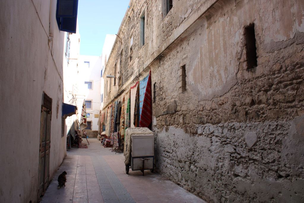 Cross a cat and catch a glimpse of some carpets hanging on the old stone walls.