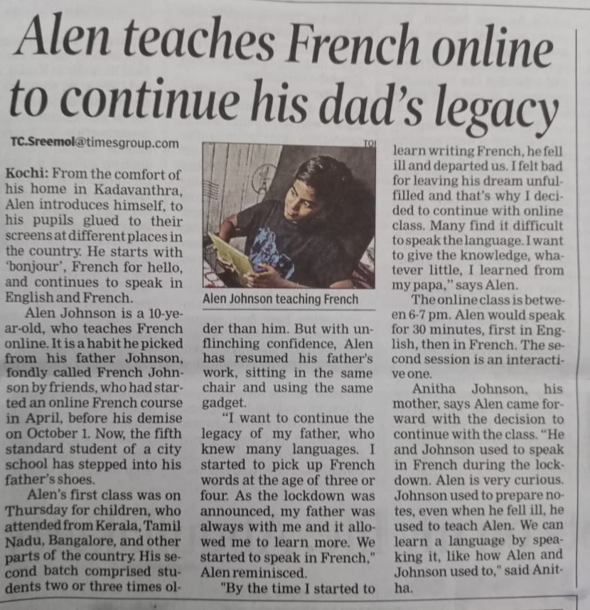 And we learn at this very moment that Alen, your son, to whom you passed on your passion for foreign languages, has decided to take up the challenge of teaching them, even though you are no longer at his side. At the age of ten, he launches an online English-French course from his screen! A worthy son of his father, as lively and hard-working as you were! You were passionate about foreign languages because you were passionate about human encounters and our meeting was really exciting!