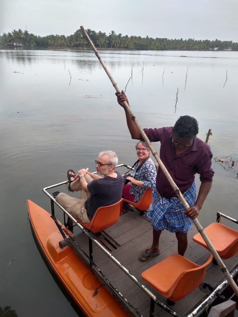 A little later in the day, after visiting the surroundings, approaching the waterfront from the left side of the house, we discover their project: to launch ourselves, on board a recycled pedal boat, to cross the backwaters. Indeed, our friends from Perumpally are fervent ecologists and recycle everything, even an old pedal boat into a rowboat. Following the 2004 Tsunami, which devastated the area, they even moved this house on stilts from one side of the lagoon to the other. They now have at heart not to pollute the water of the lagoon any more as the tourist house-boats, with engine, which furrow the backwaters. Our friends at Perumpally are now campaigning for a solidarity economy and the introduction of eco-tourism.