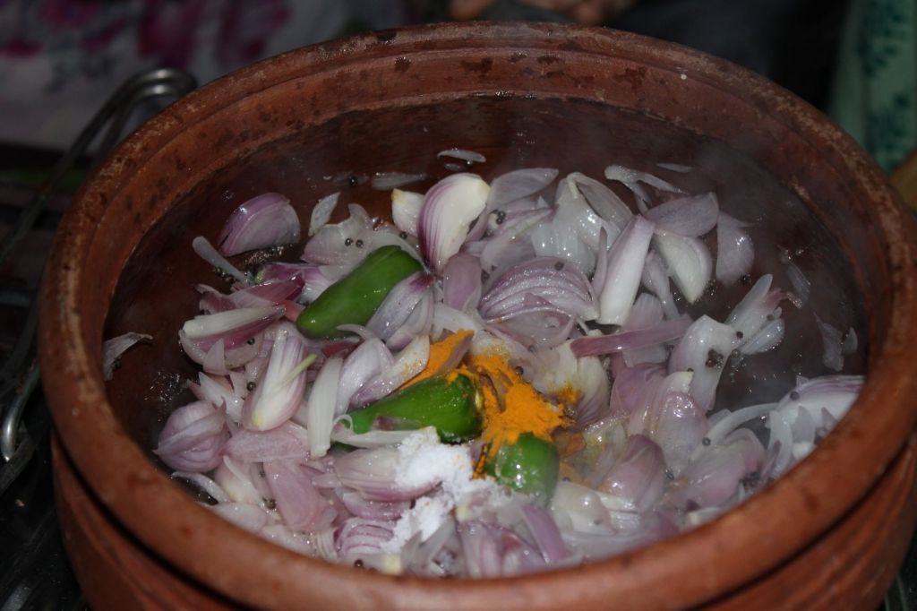 Next, the pestle is used to crush the garlic, ginger and spices. It starts to smell good.