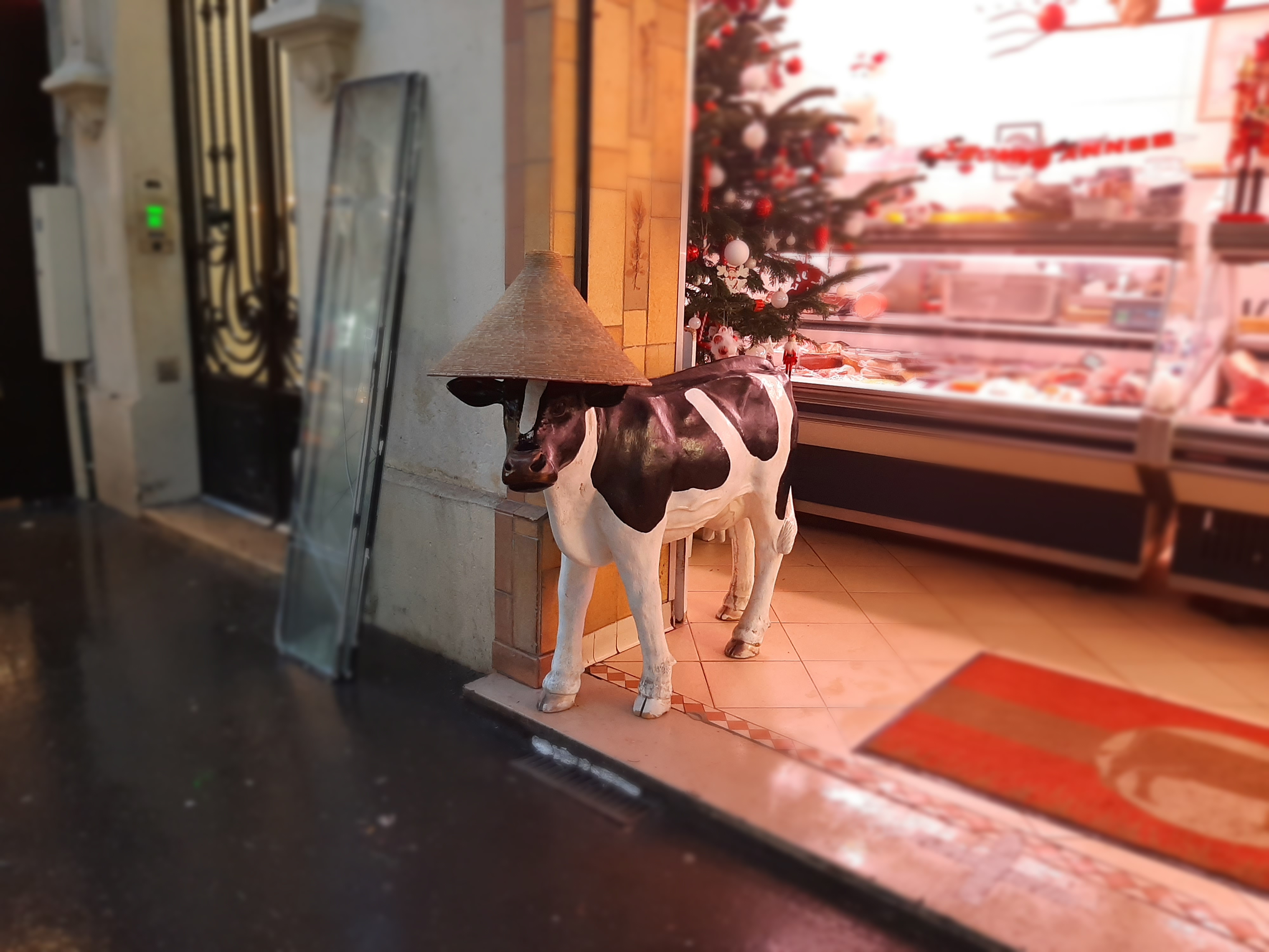 Being surprised, suddenly, to come across a small calf covered with an Asian hat at the entrance to Monsieur le Boucher’s house.
