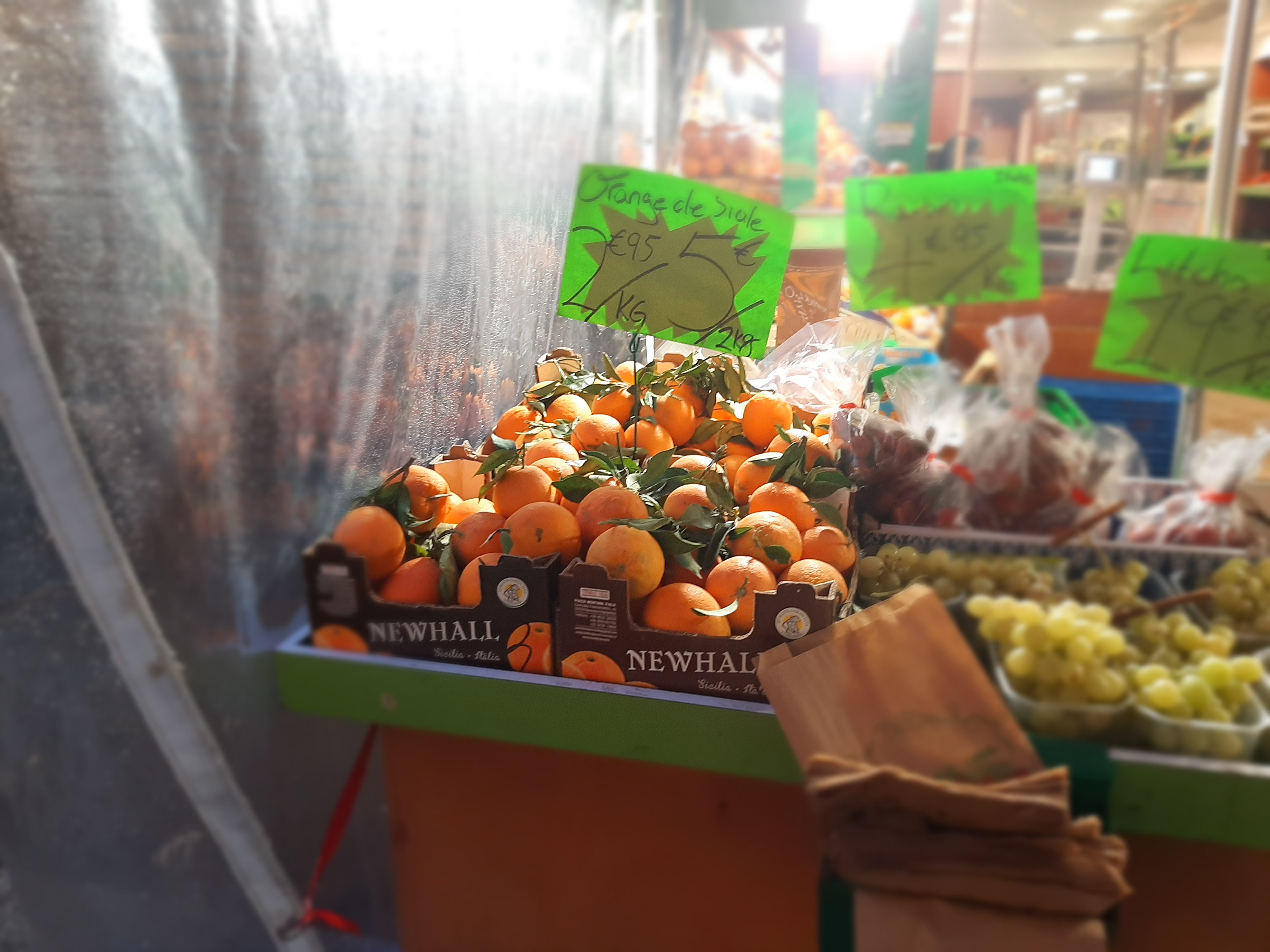 Appreciate again the beautiful pyramids of oranges, grapes…