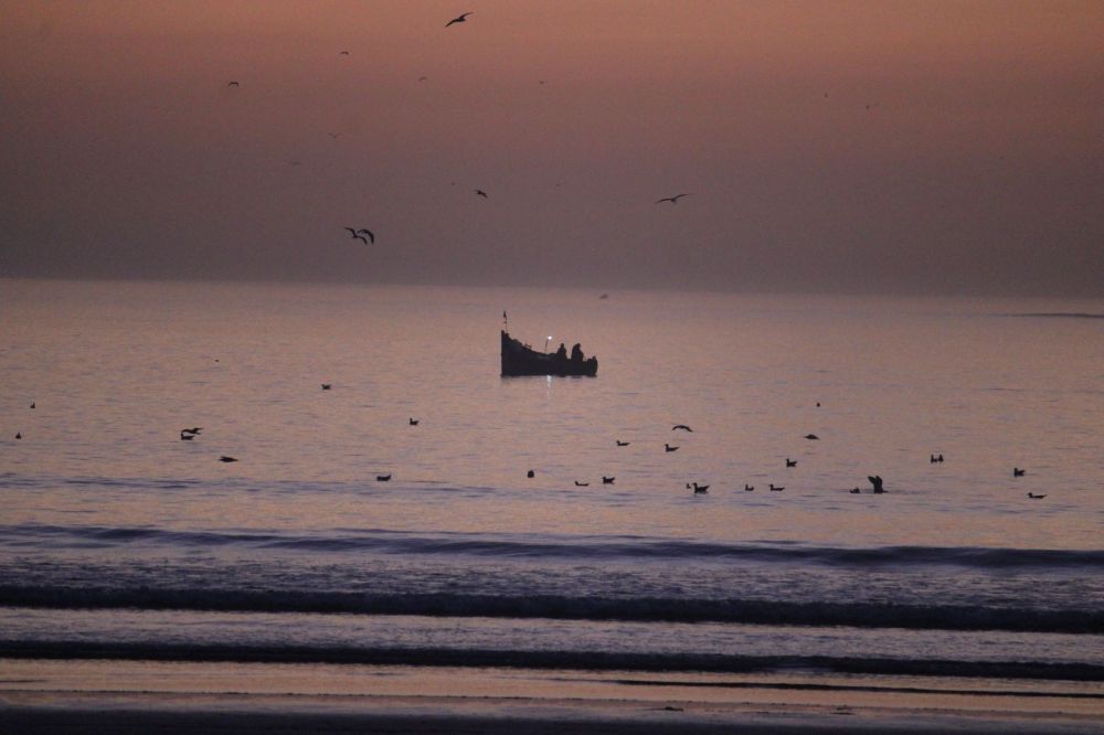 Et contempler en contre jour, quelques pêcheurs qui relèvent leurs filets face à la grande plage, au sud du port.