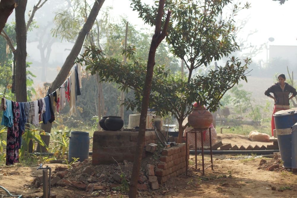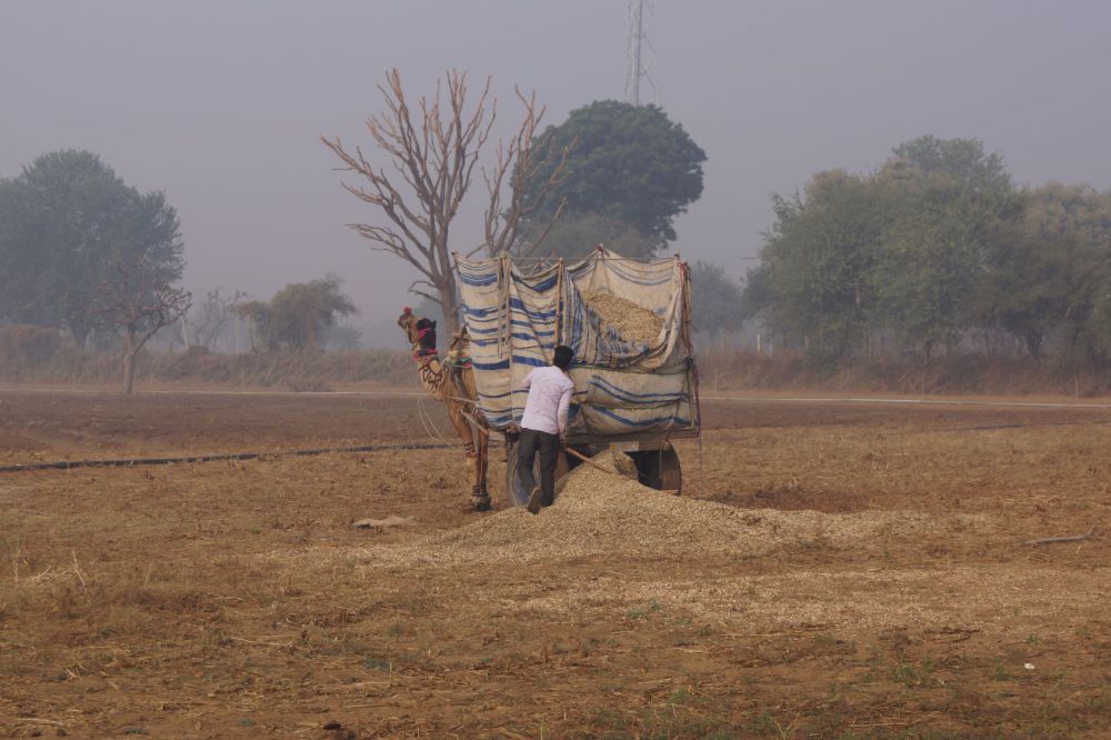 Lever du soleil sur la campagne dans le Shekawati au nord-est du Rajasthan. Une région semi-aride dans laquelle les hommes éliminent les feuilles des arbres à cette saison pour permettre aux cultures de pousser un peu. Porte ouverte sur le désert du Thar, il fait déjà bon dès le matin.