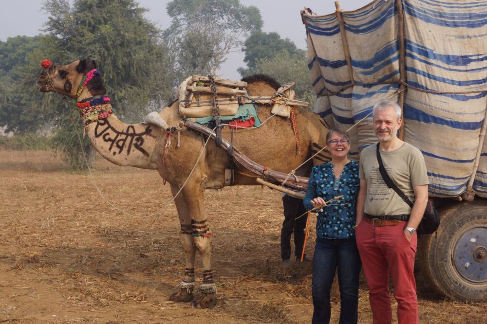 Faire connaissance avec le chameau du jeune fils de la famille.