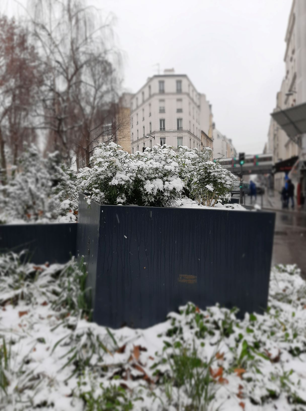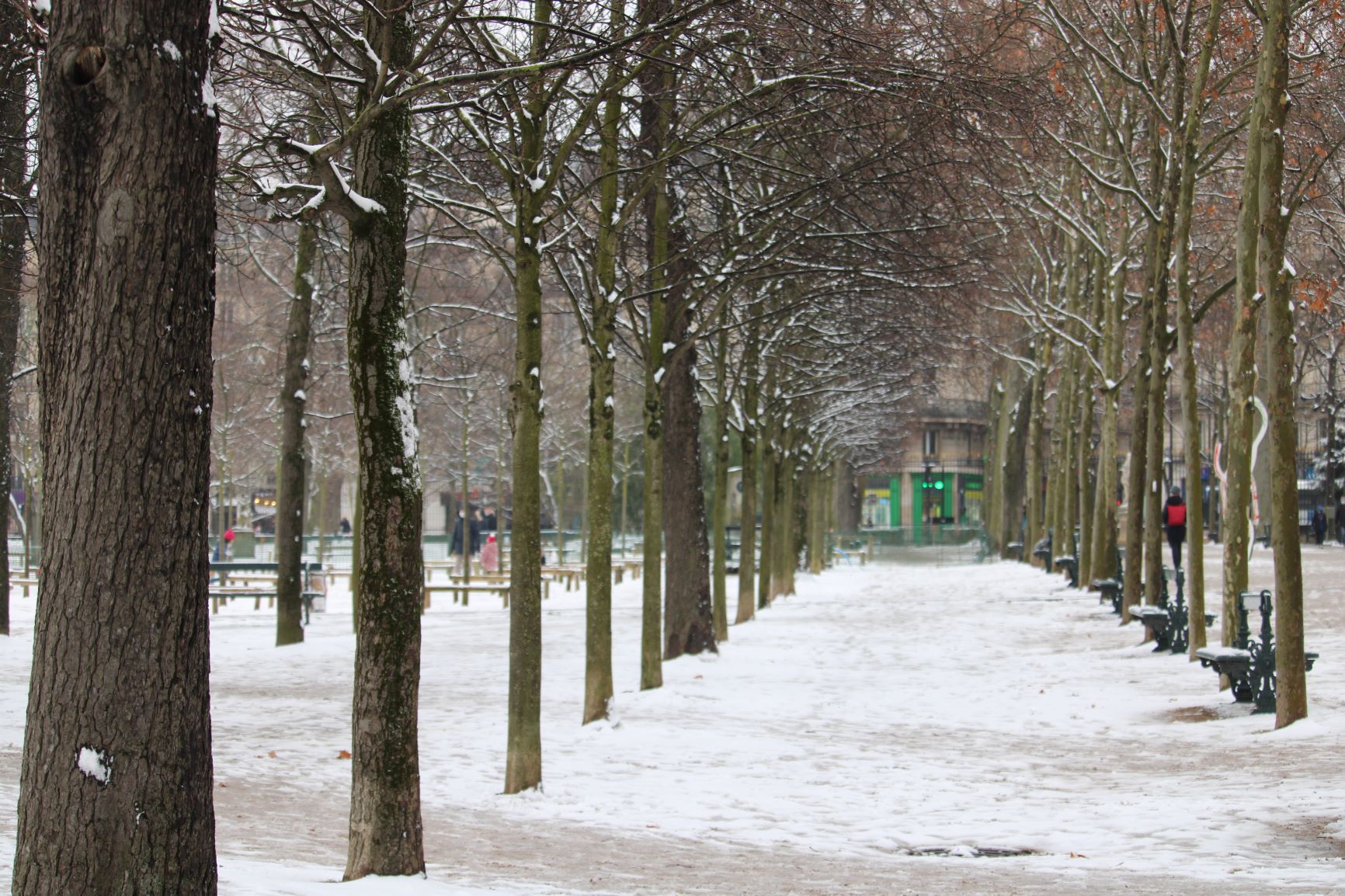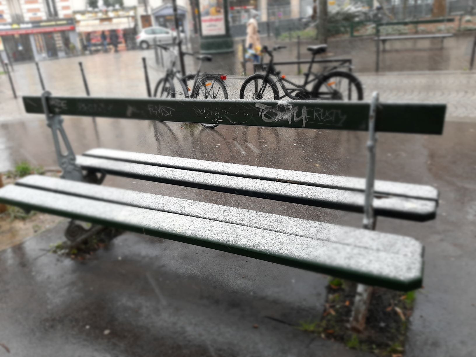 Barely an hour later, here it is spreading out over the city. At first discreet, it lays a tiny veil on the Parisian benches.
