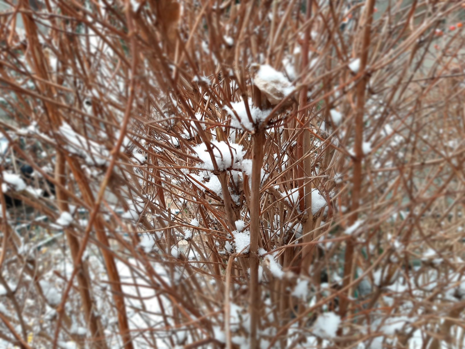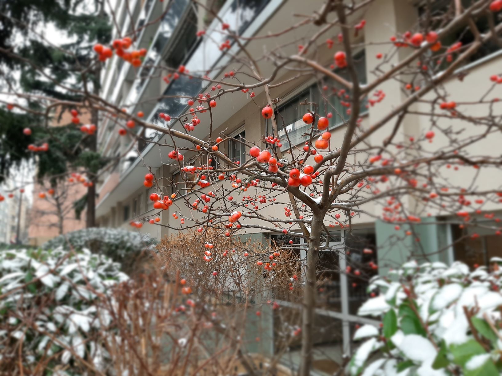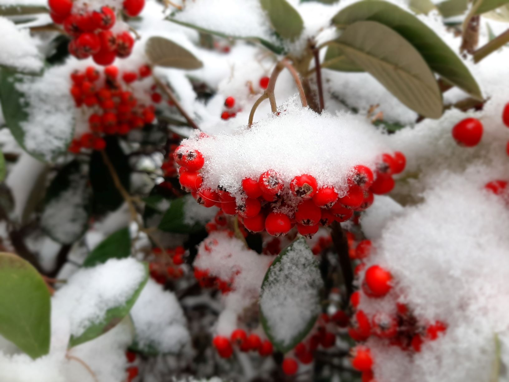 The small red berries initially try to resist and hope to remain visible under this new all-white cloak.