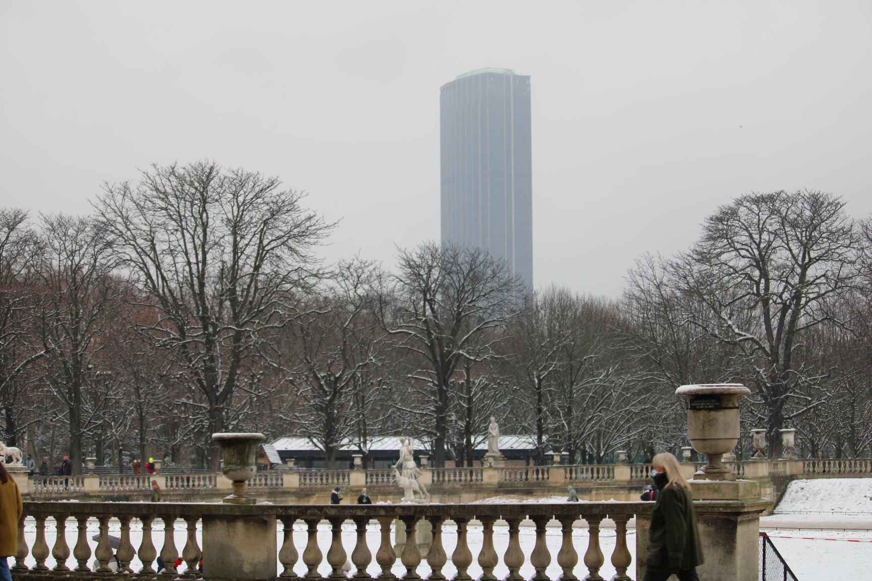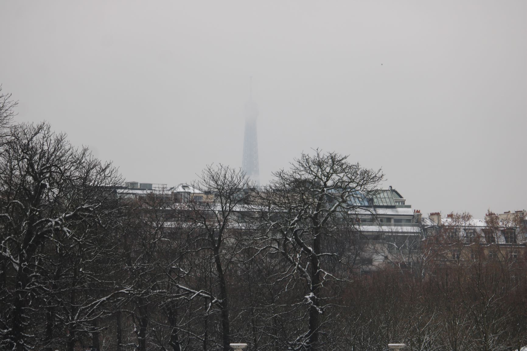 …but here she is rising from behind the curtain of snowflakes in the Paris sky.