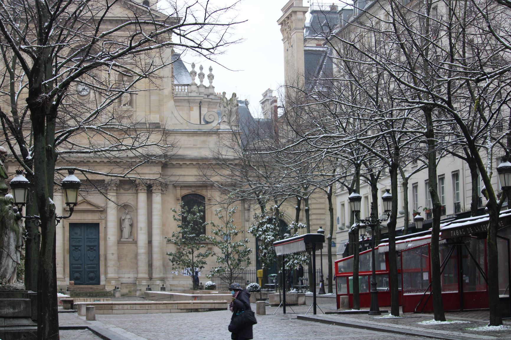 Place de la Sorbonne here it now discreetly intrudes on the terraces.