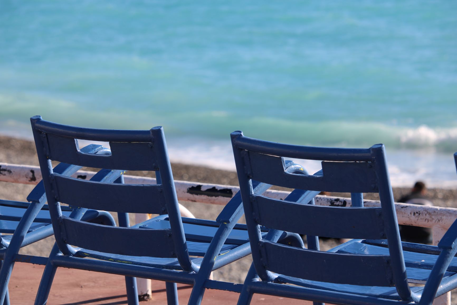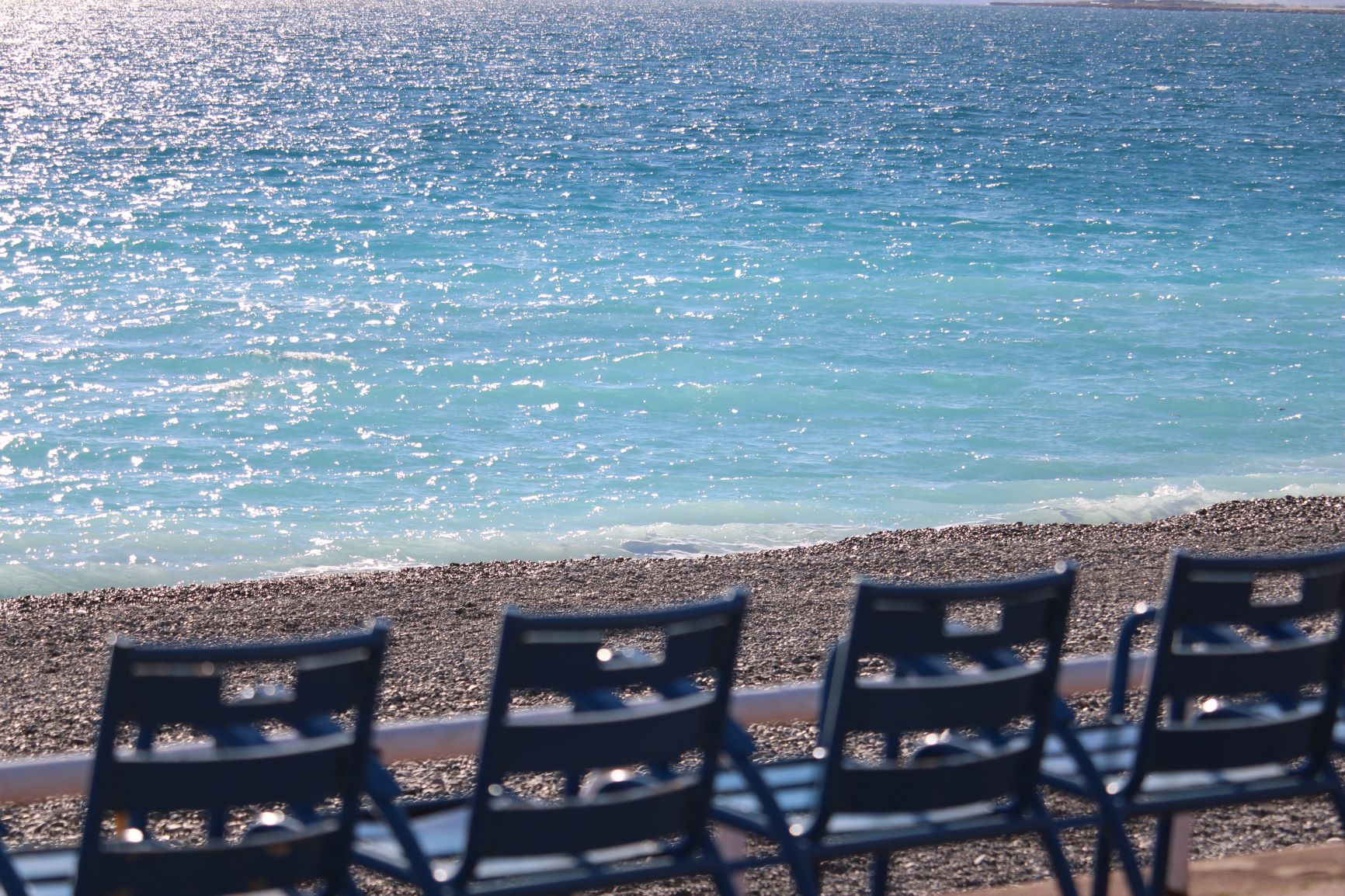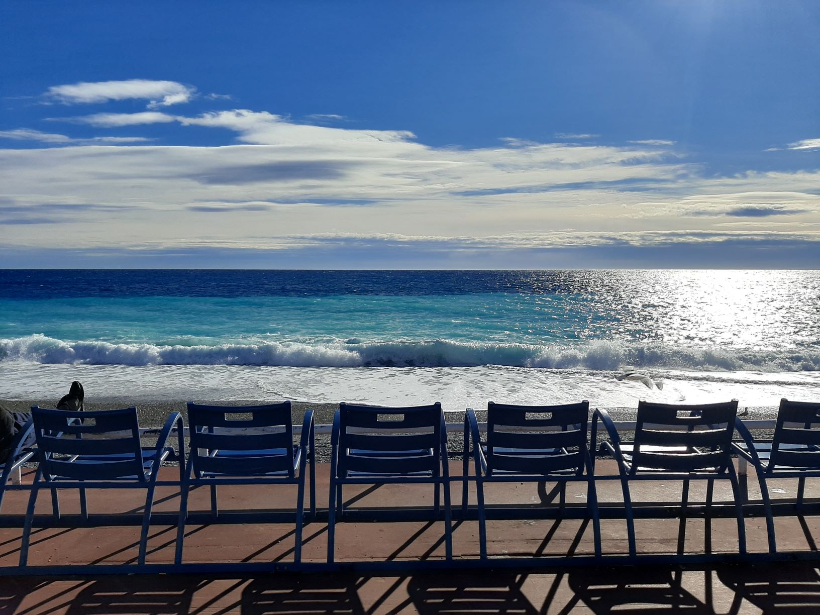 A peine arrivés de la gare, juste après quelques heures de train, découvrir se dégourdissant les jambes, les alignements de sièges et le dégradé de bleus sur la Méditerranée.