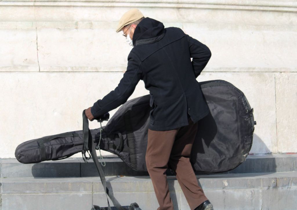 Discovering a double bass that takes its ease in the square gives wings to most Sunday morning passers-by.