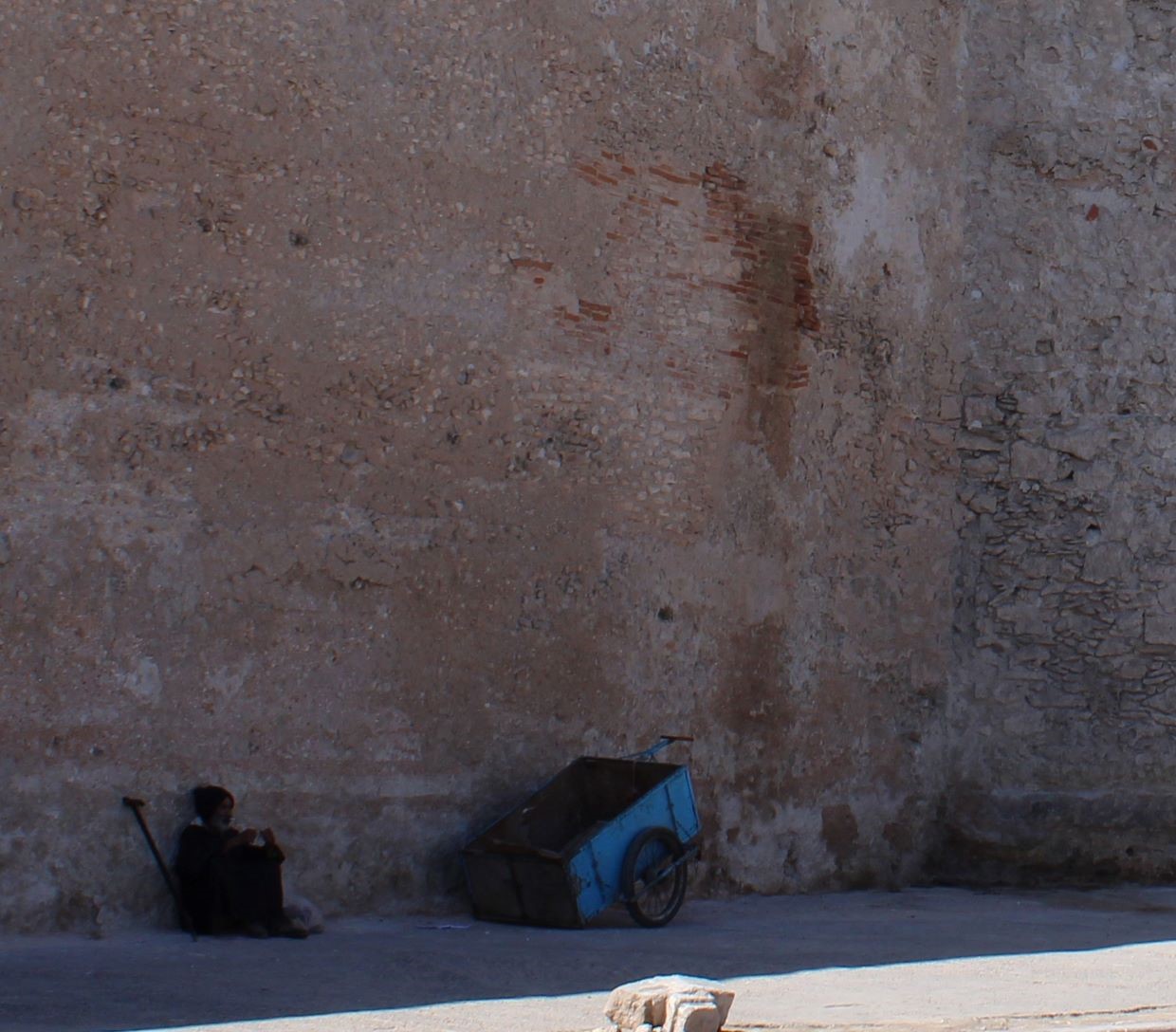 Sur la grande place toute ensoleillée, rencontrer la silhouette d’un vieil homme qui s’aide de sa canne pour avancer.