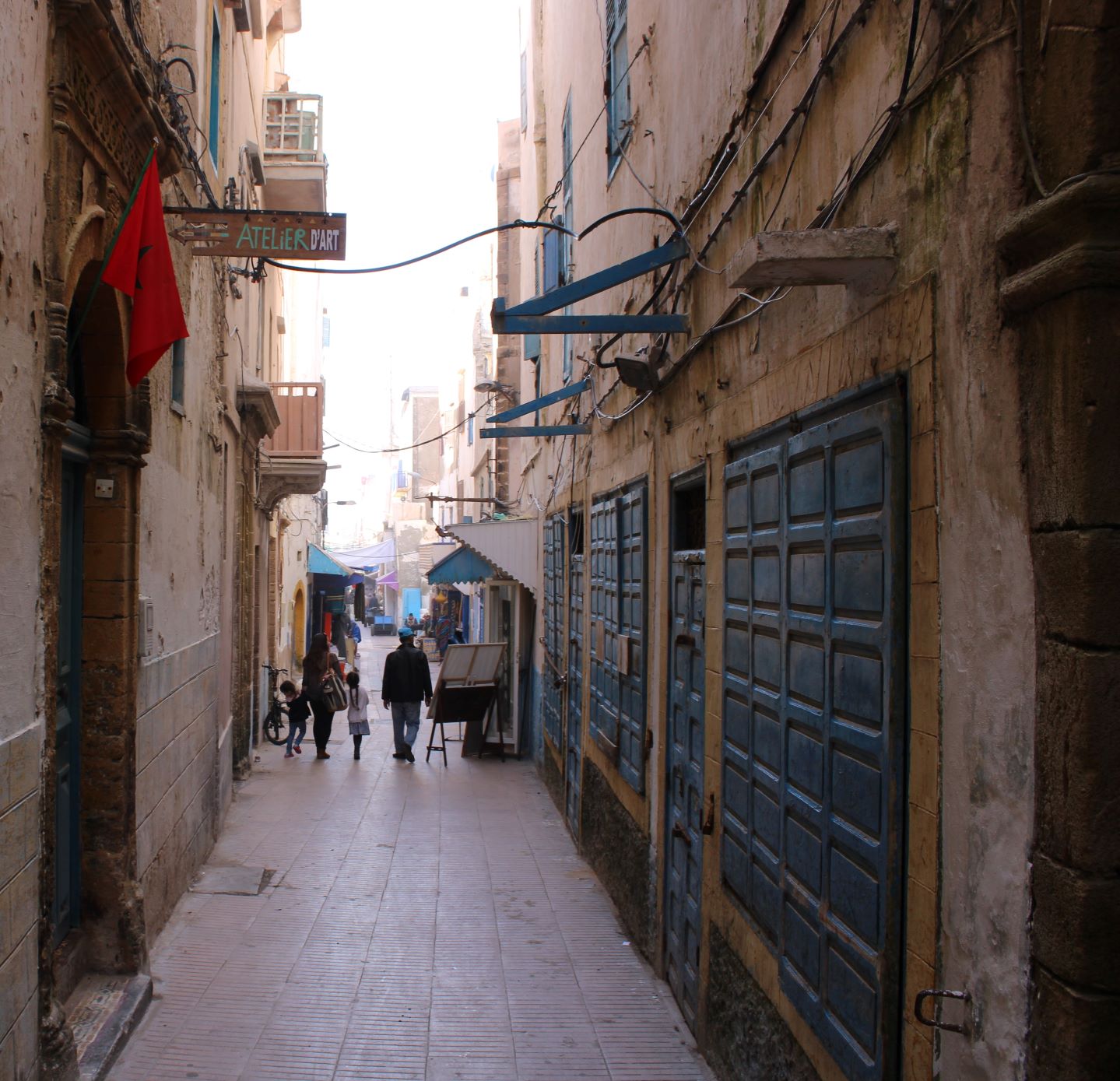 Entrapercevoir une famille qui se promène dans les rues pavées alors que les échoppes ne sont pas encore ouvertes et que les marchandises n’ont pas encore pris toute la place dans les étroites ruelles.