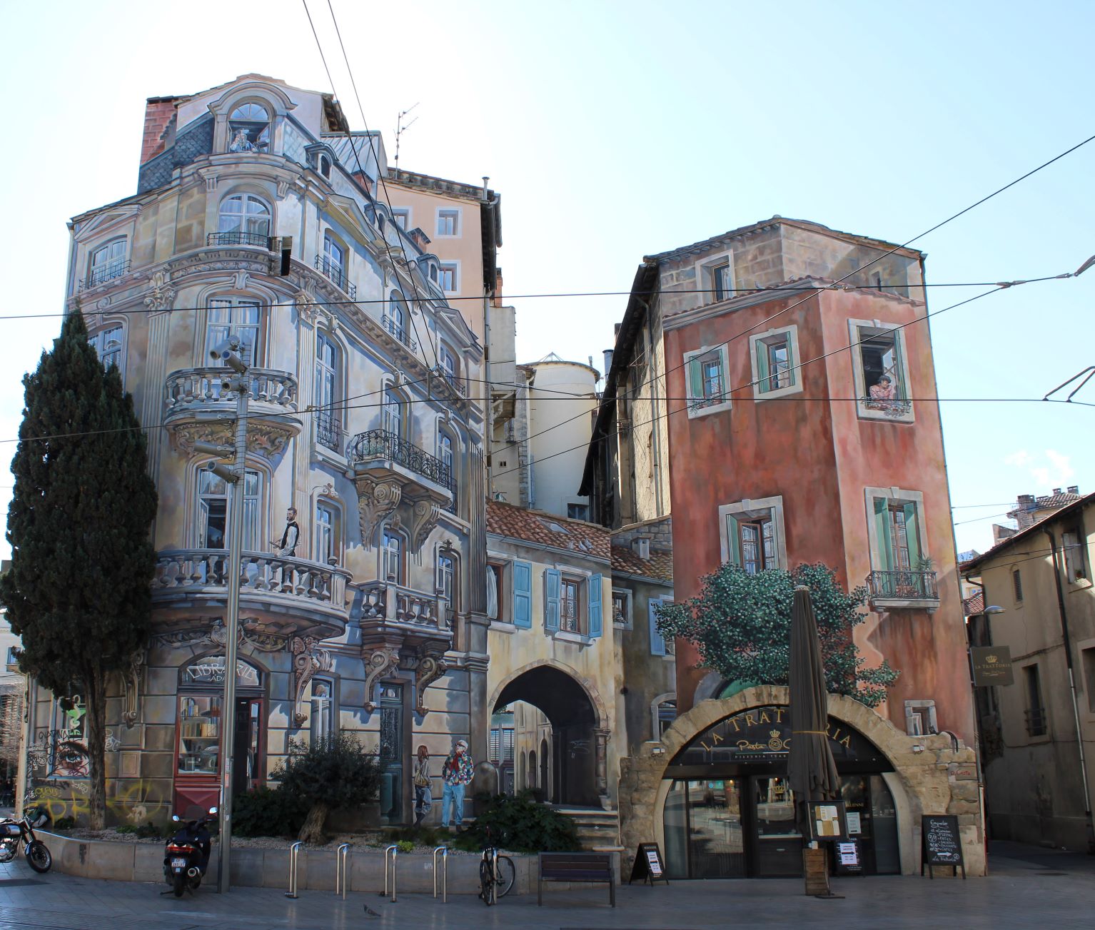 S’arrêter ensuite pour contempler le superbe trompe-l’oeil devant la Trattoria.
