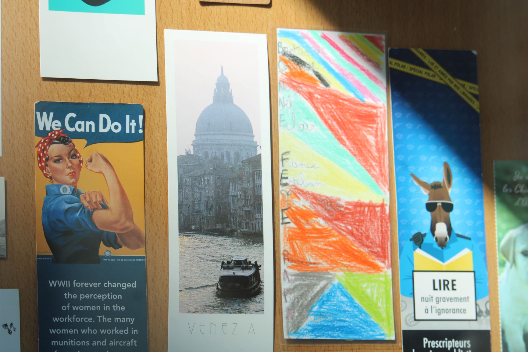 In the window of the library, marvel at all the bookmarks forgotten between the leaves of the books.