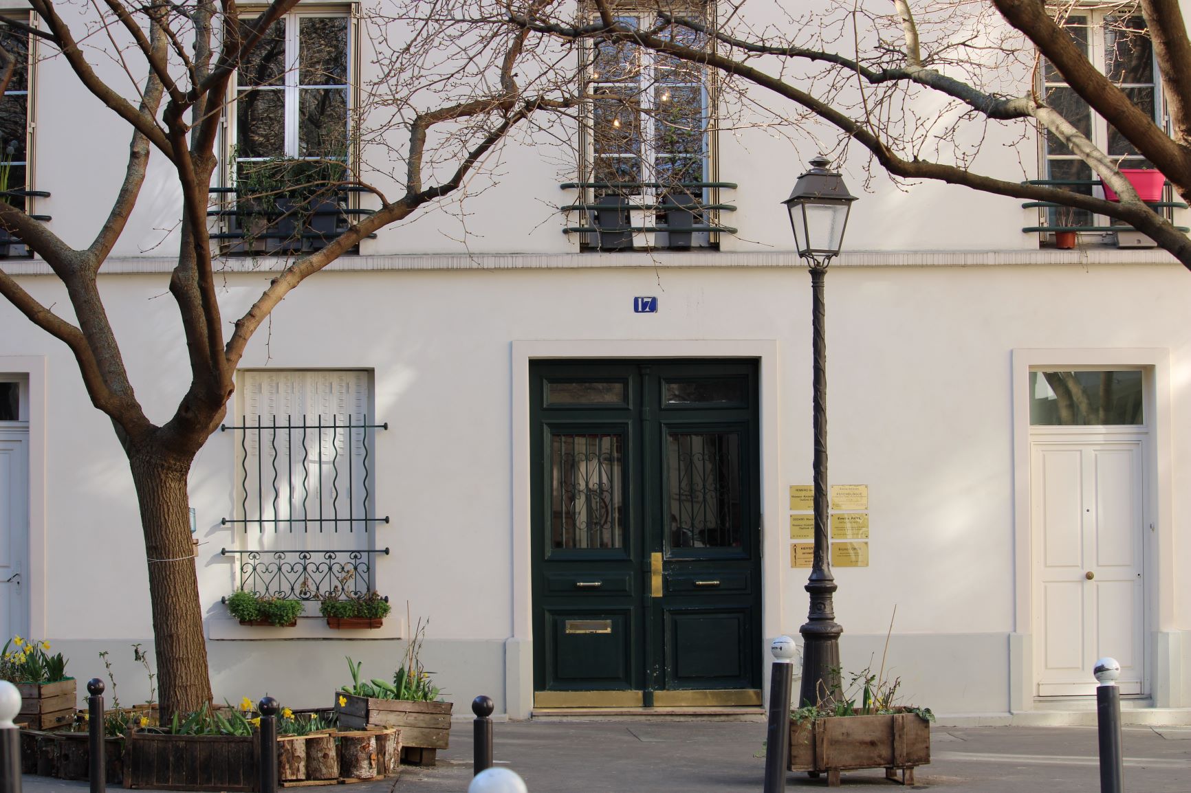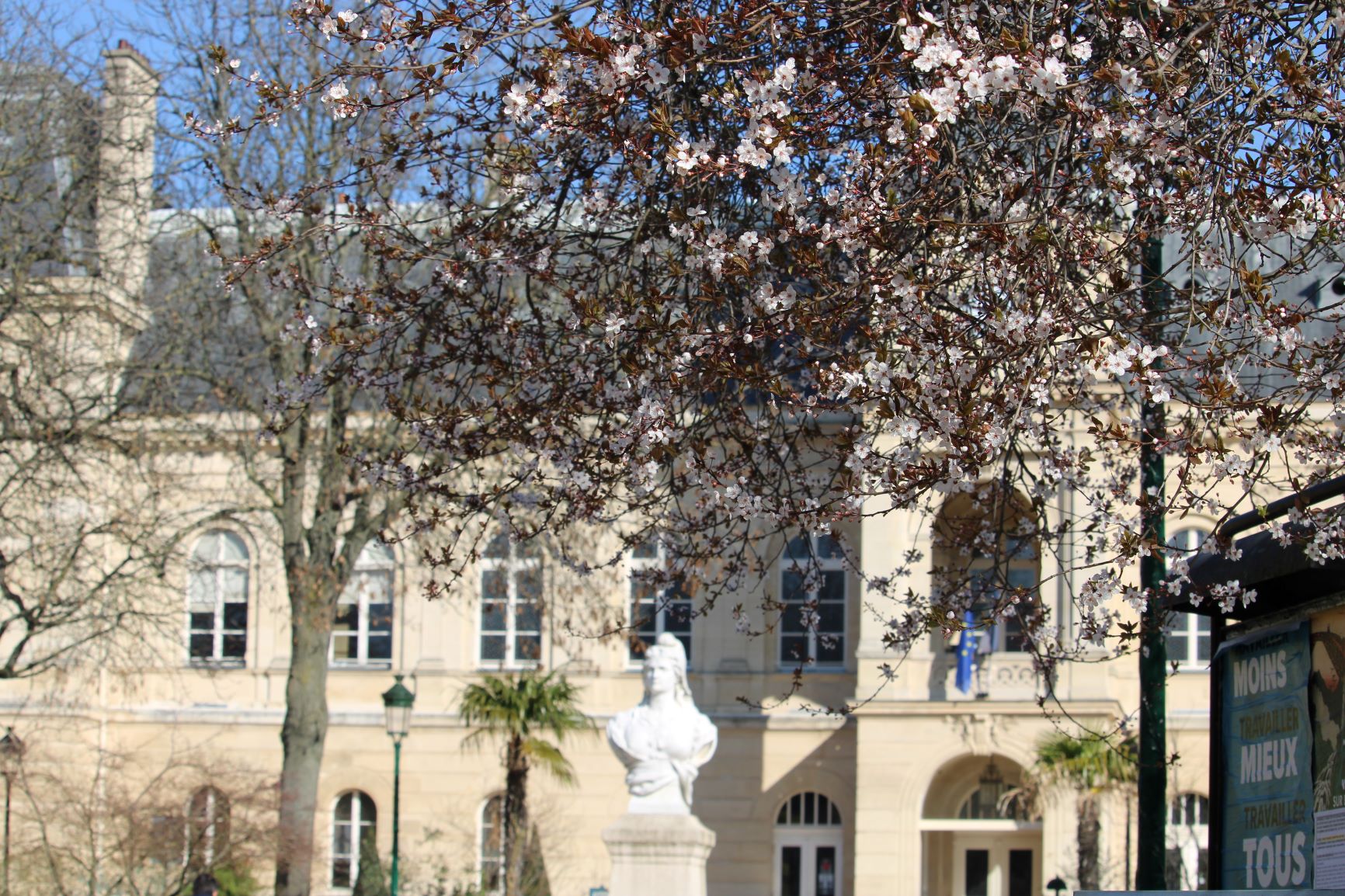 Looking at the façade of the town hall through the flowering trees.