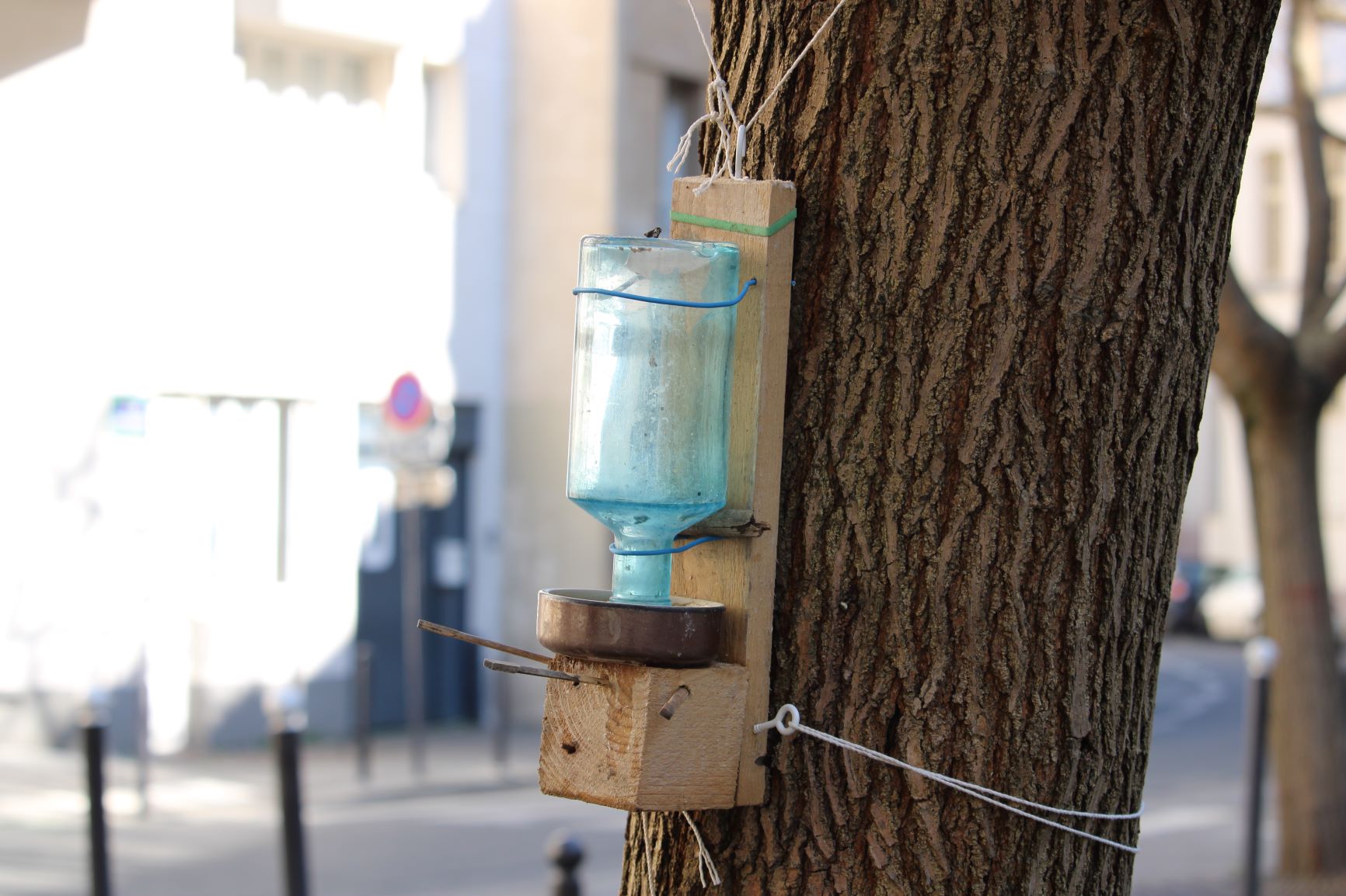 Distinguish a small bird drinking trough made on a tree trunk.