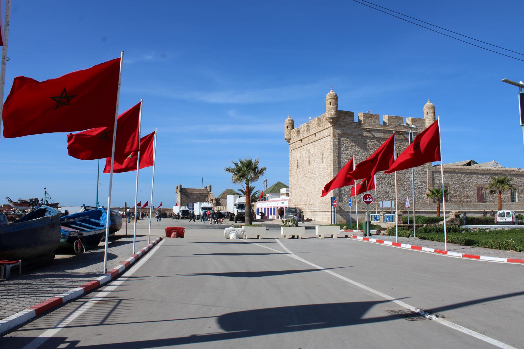 Apprécier les grands drapeaux marocains rouge vifs qui flottent dans le ciel bleu électrique.