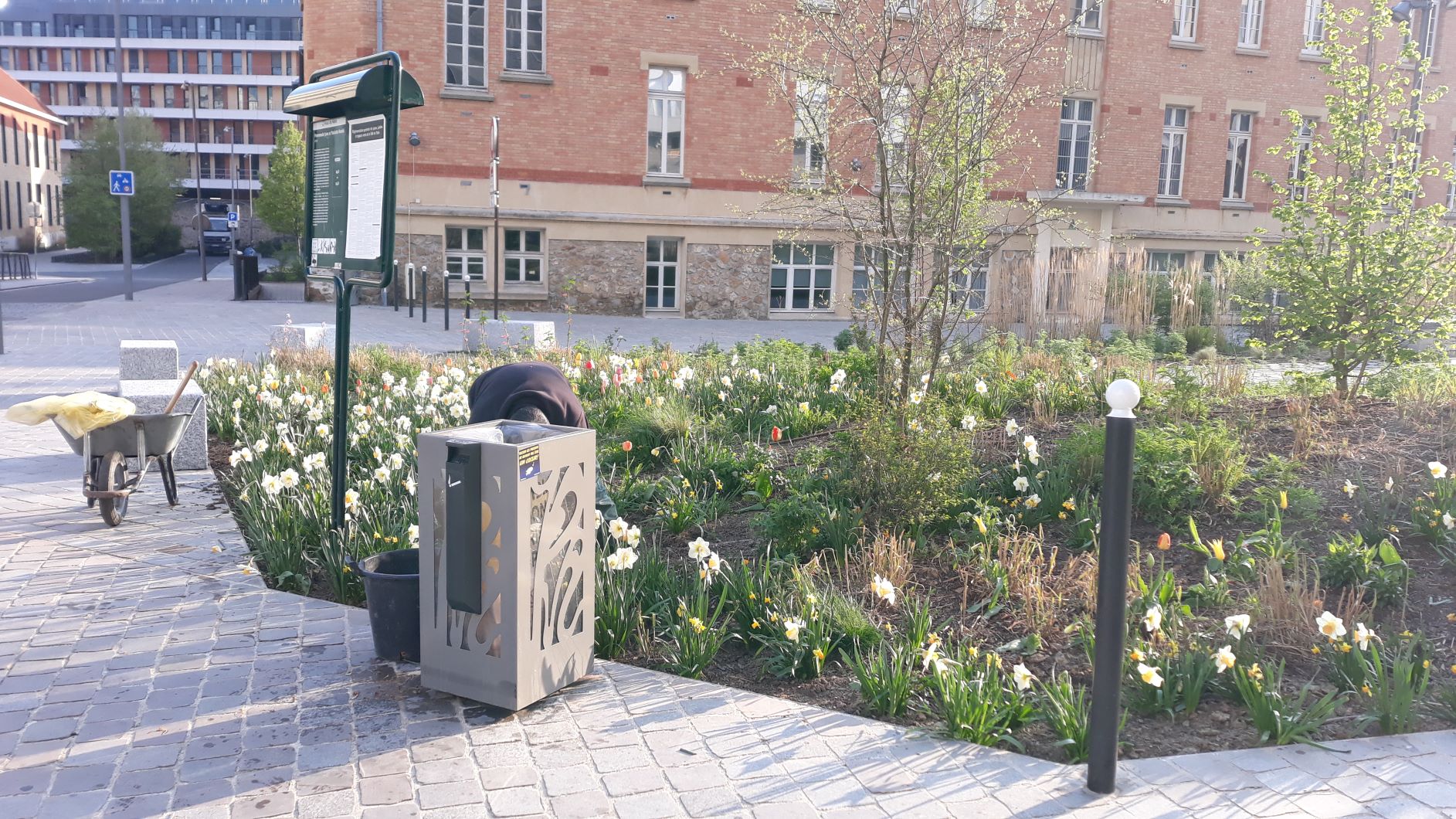 Caché derrière une poubelle – désolé, je file au boulot, et je suis déjà un peu en retard, ce qui n’est pas idéal pour le cadrage ! -, un de ceux qui nous rappellent que les magnifiques massifs ne se font pas tout seul. Bravo les jardiniers !