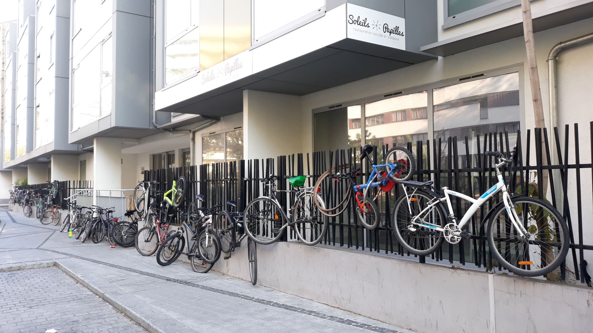 Sur le côté gauche de la fin de la rue des Arbustes, nous nous étonnons de découvrir des vélos en suspension…