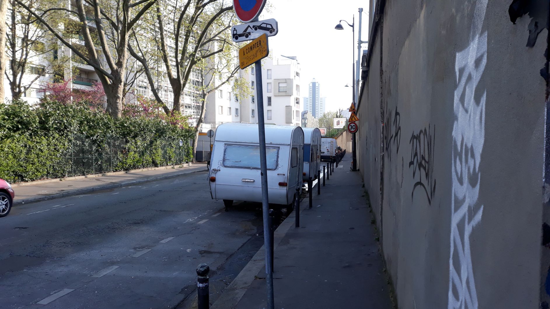 Au débouché, des caravanes abritant des ferrailleurs de l’Est, déjà parti faire la collecte à l’heure ou je passe.