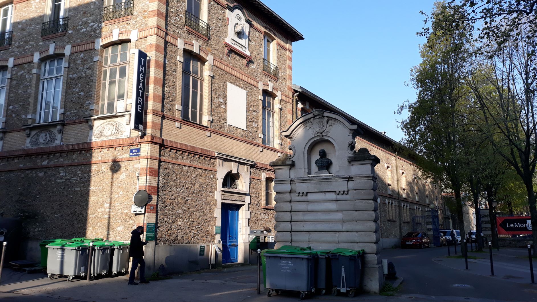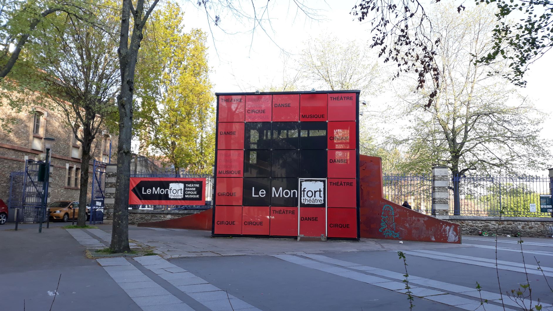 Nous traversons le parc en empruntant le chemin qui longe la petite ceinture, ce qui nous permet de voir les bâtiments du théâtre Monfort.