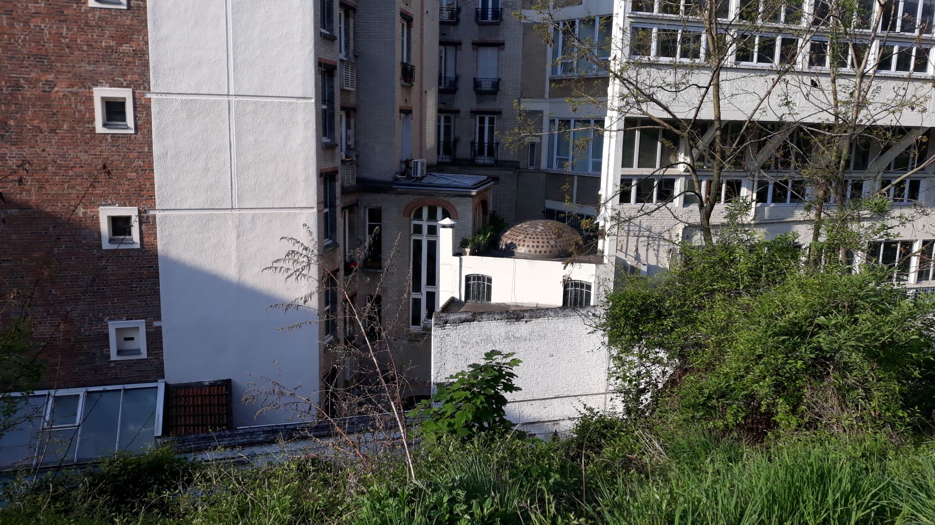 En bas du talus, à gauche, des immeubles imbriqués, avec au milieu, une petit coupole apportant une touche d’exotisme.