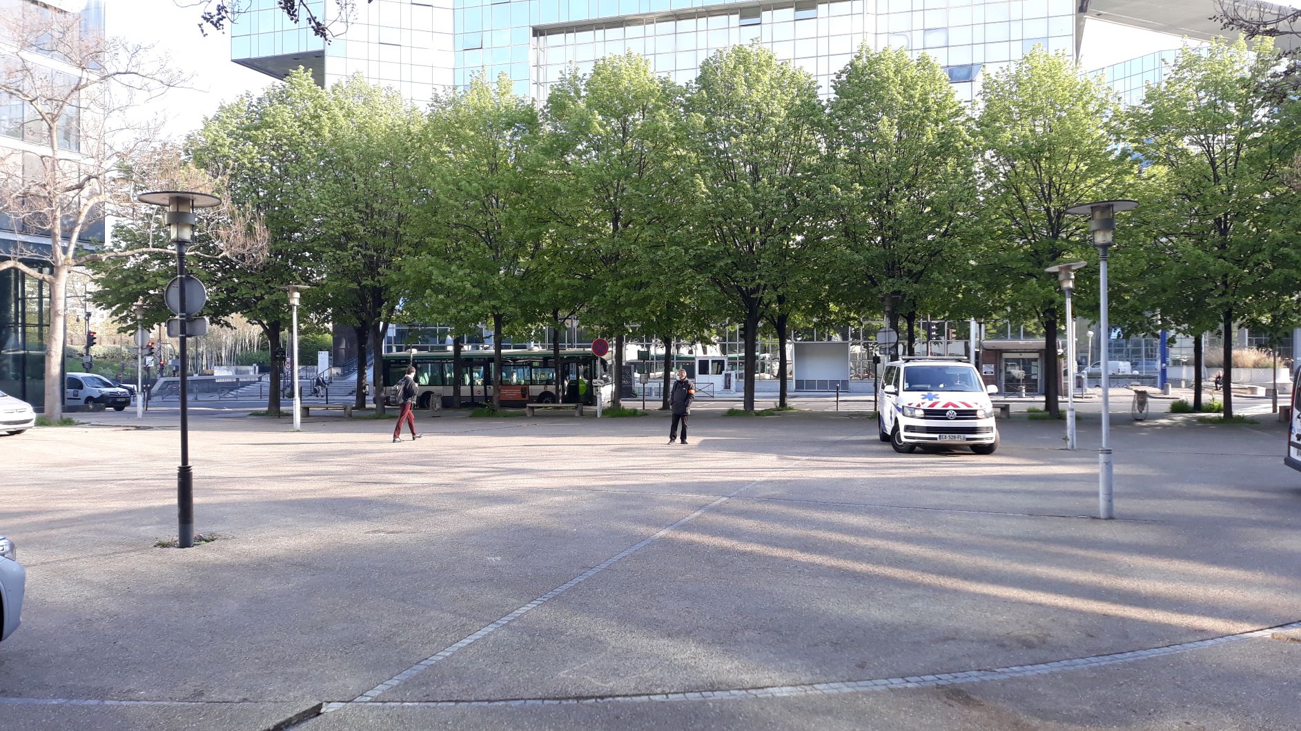 La place Albert Cohen encore bien vide ce matin. En effet, durant les travaux signalés précédemment, le parking des ambulances est inaccessible. Alors c’est ici, sous les arbres, que les ambulanciers viennent déposer et reprendre les patients. Dans une heure, il n’y aurait plus une place de libre, si l’employé de la sécurité, que vous reconnaissez à son brassard rouge, n’y mettait pas un peu d’ordre !