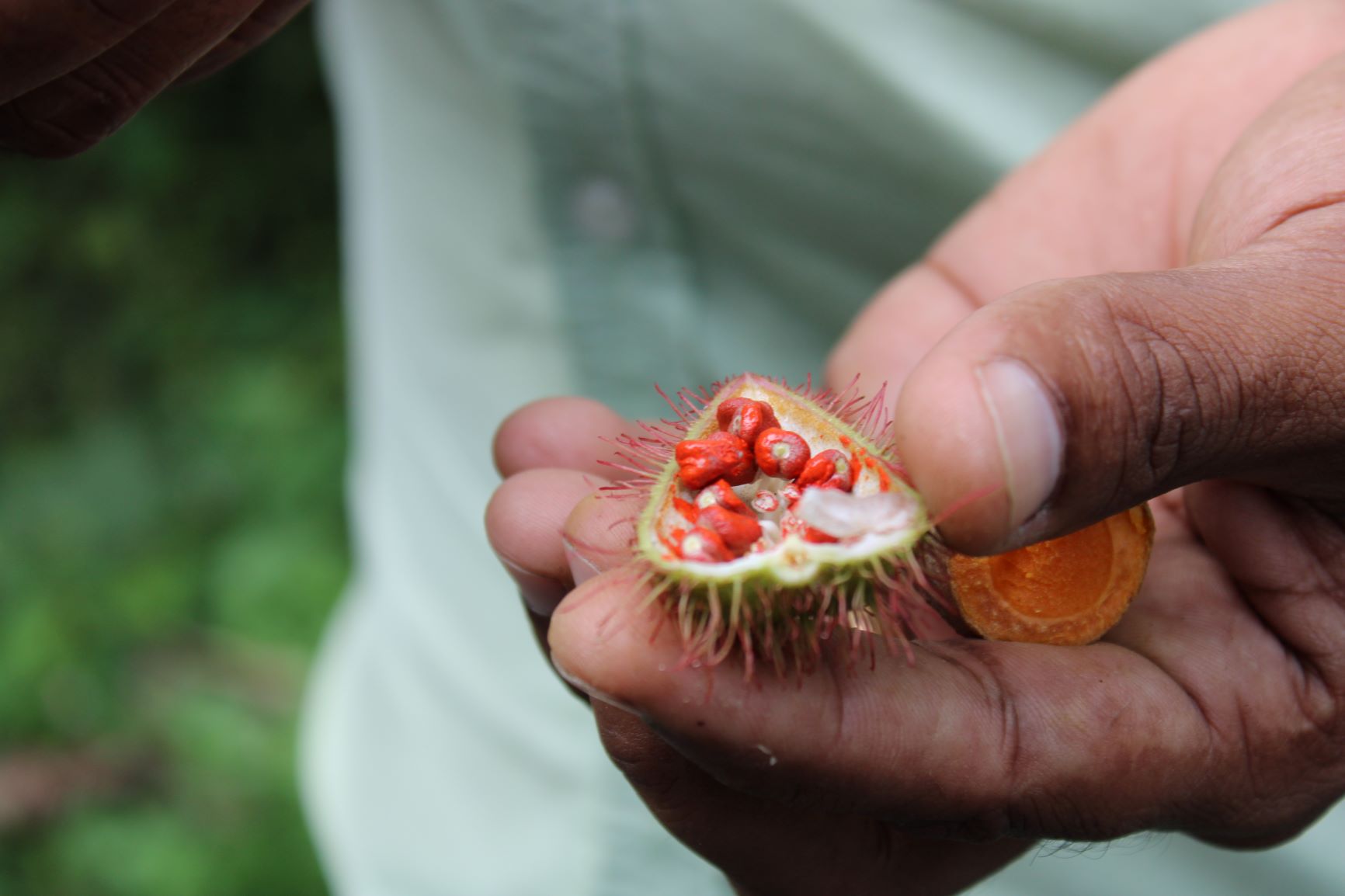 We are then delighted to discover the fruits of the roucou or bixa tree which allow Indian women to adorn themselves with their famous bindi on the forehead. It is also used as a body pigment, dye or flavouring. In our region, it is also found in the Avesnes dumplings.