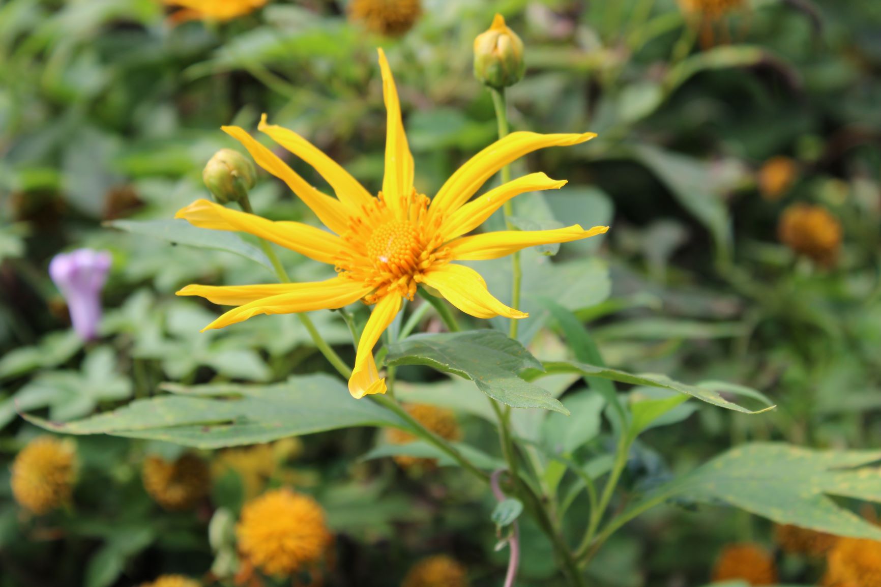 In the midst of this variation of greens, we are delighted to see a few spots of colour scattered by the hibiscus.
