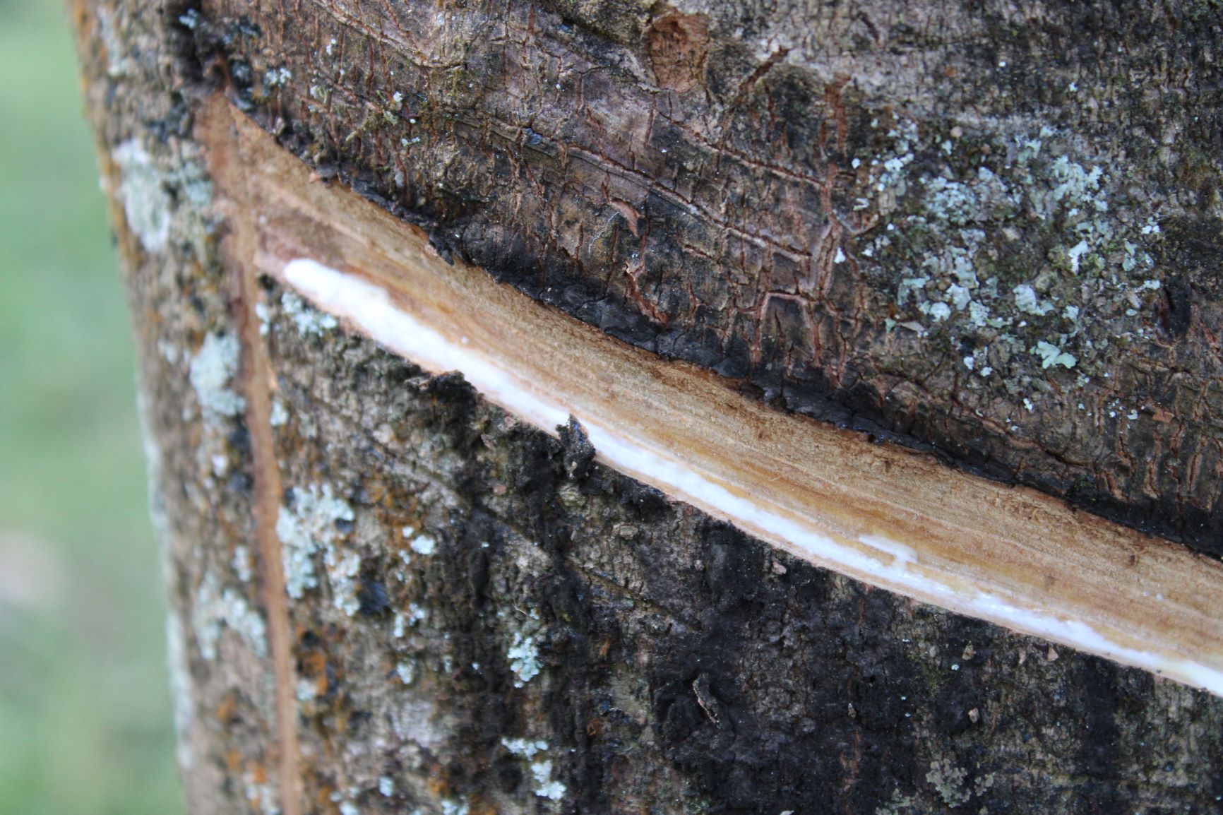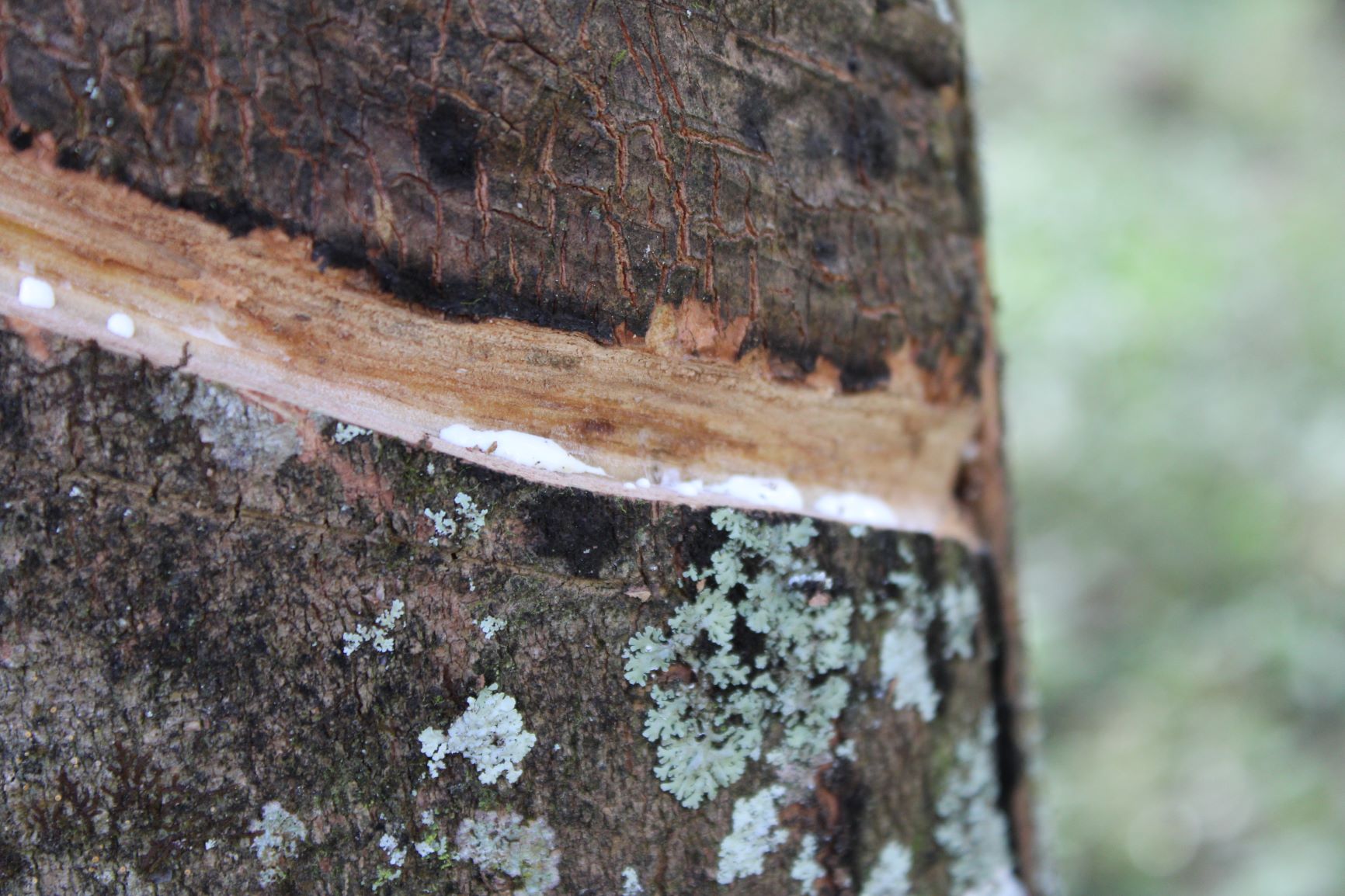 A small cut should be made in the bark, neither too deep nor too light. The first drops of latex will then appear and bead on the surface.