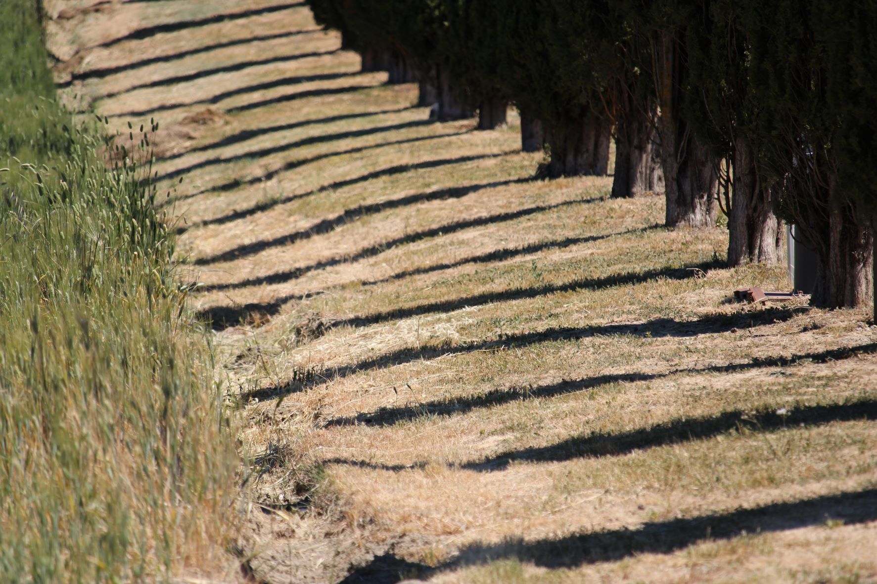 Lì, un ulivo circondato da file di erba appena tagliata cattura il nostro sguardo.
