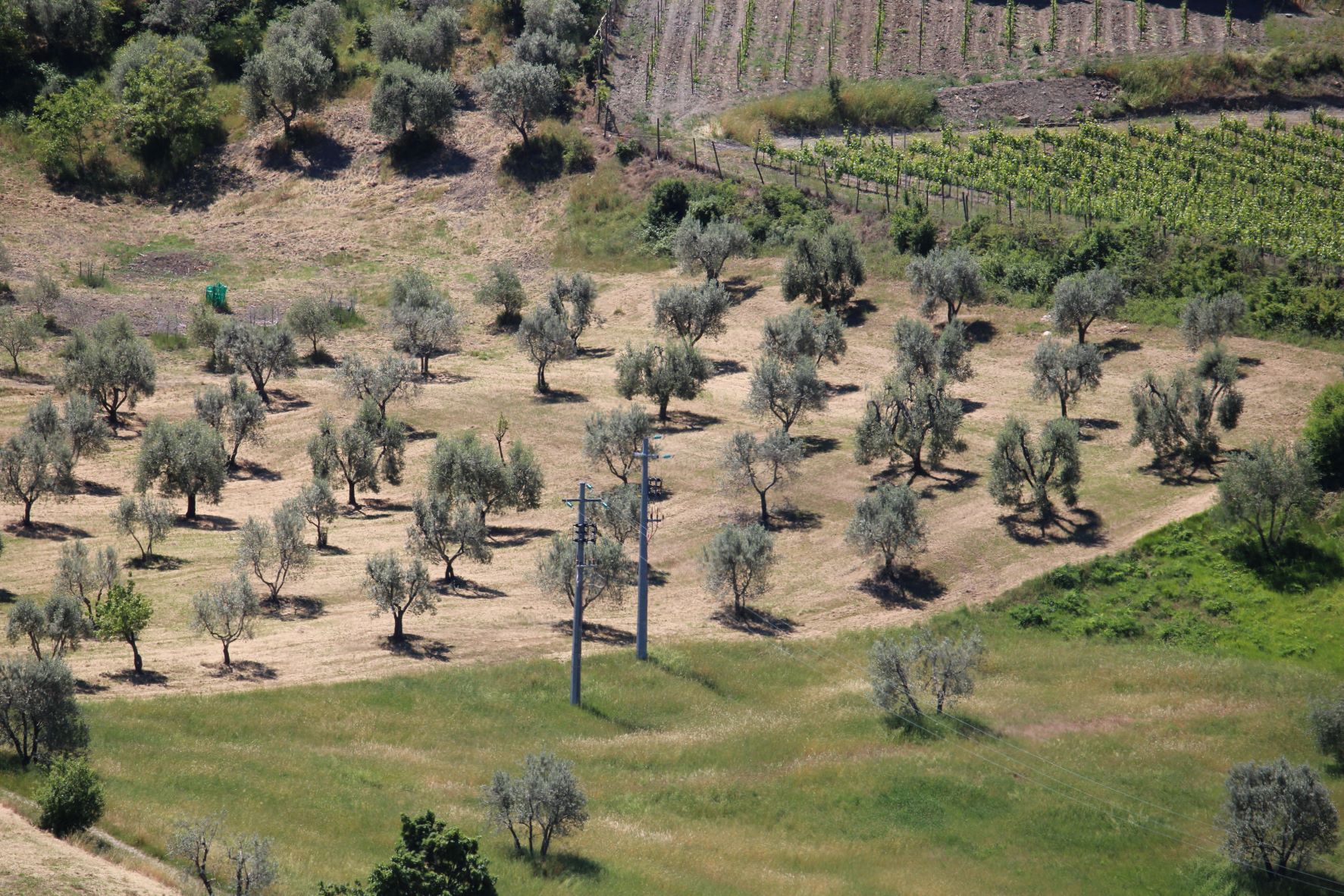 Prendendo un po’ di altezza, si apprezza la vista sugli ulivi la cui ombra disegna un piccolo cerchio ai piedi dell’albero.