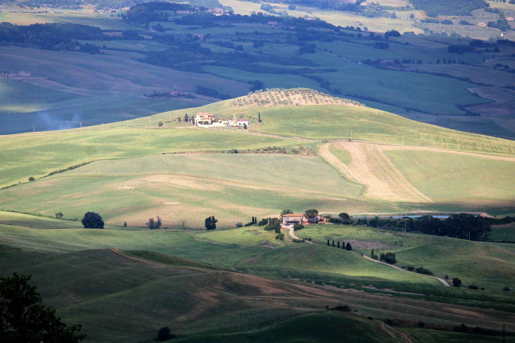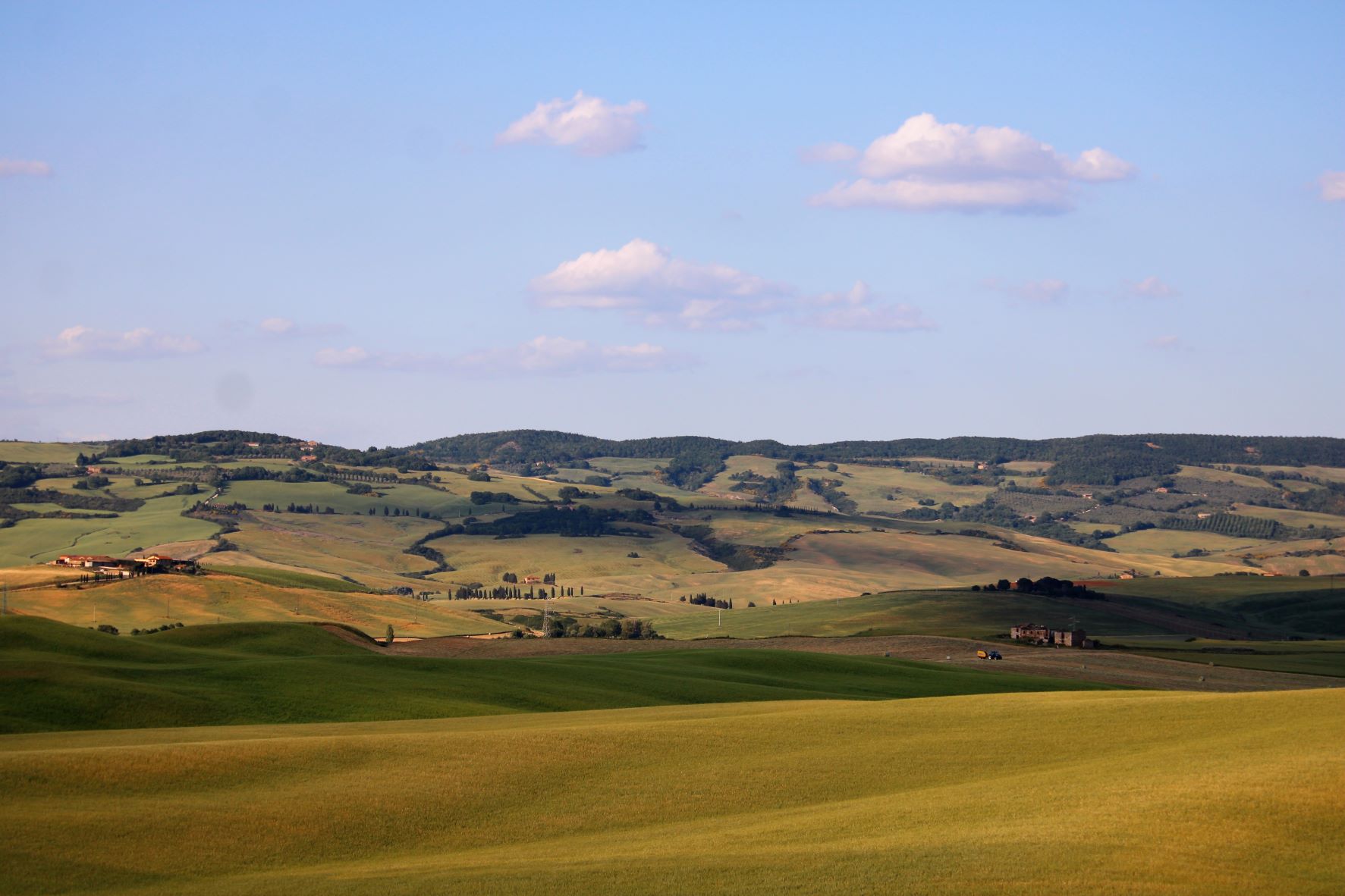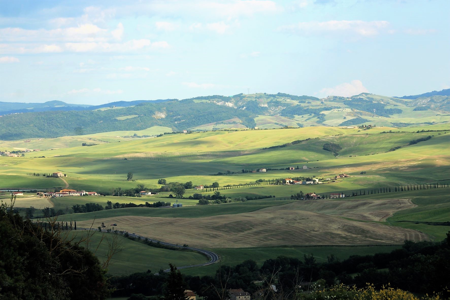 Dopo una cinquantina di chilometri, alla curva della strada, vediamo con gioia le prime valli della Val d’Orcia…